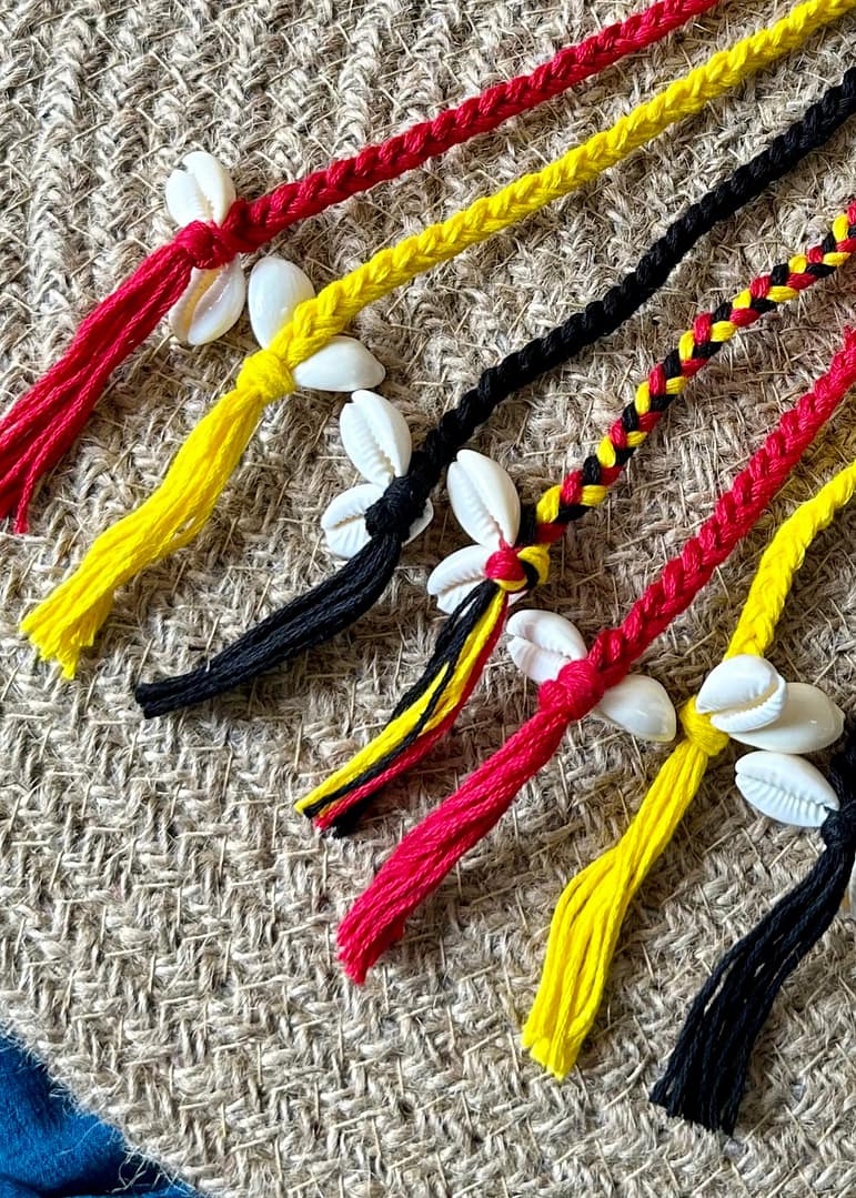 Half-moon tribal mirror jewelry set in bold red accents, colorful geometric detailing, and cowrie shells for a fierce festive look.
