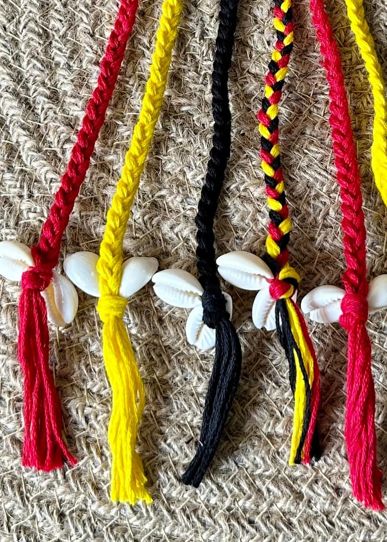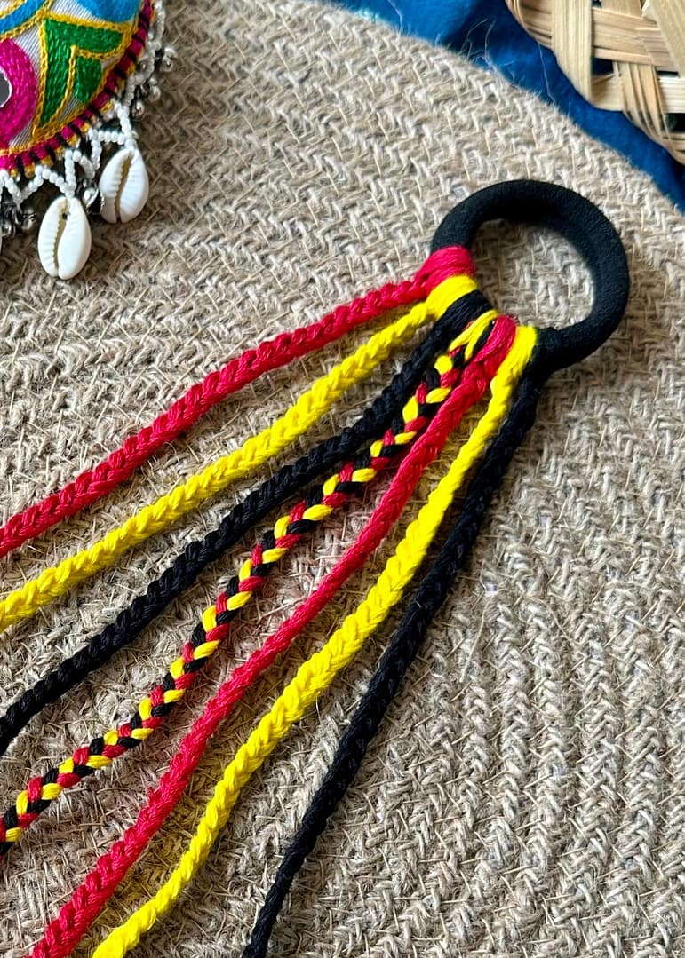 Inspired by the dynamic energies of fire (Agni) and the divine feminine (Kali), this hair tuft features striking hues of red, yellow, and black. Representing strength, passion, and protection, “Agni-Kali” is a powerful accessory for Navratri nights. The high-contrast design and rich textures add drama and vibrance to any traditional outfit. Feel the power with every twirl.