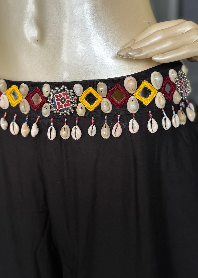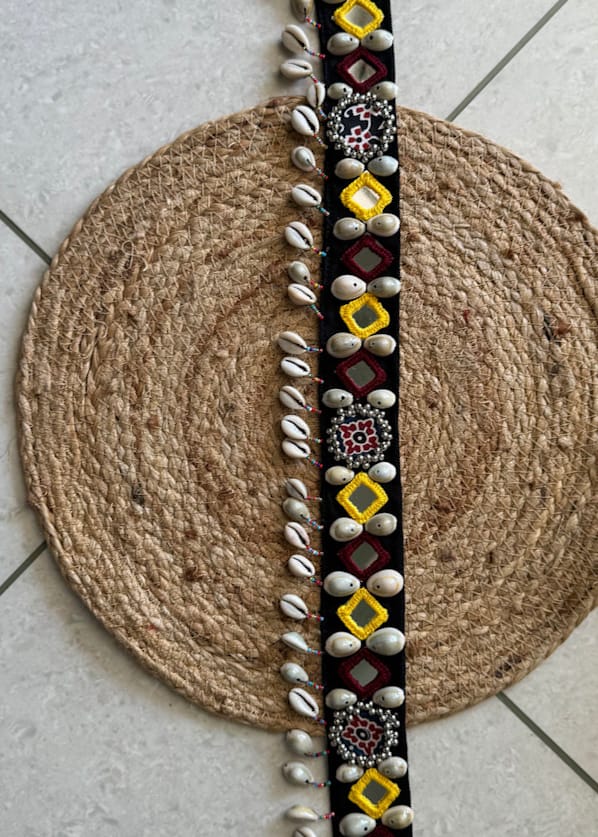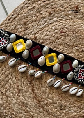 Vibrant handcrafted mirror-thread embroidered belt with decorative shells – add ethnic charm to your waist.