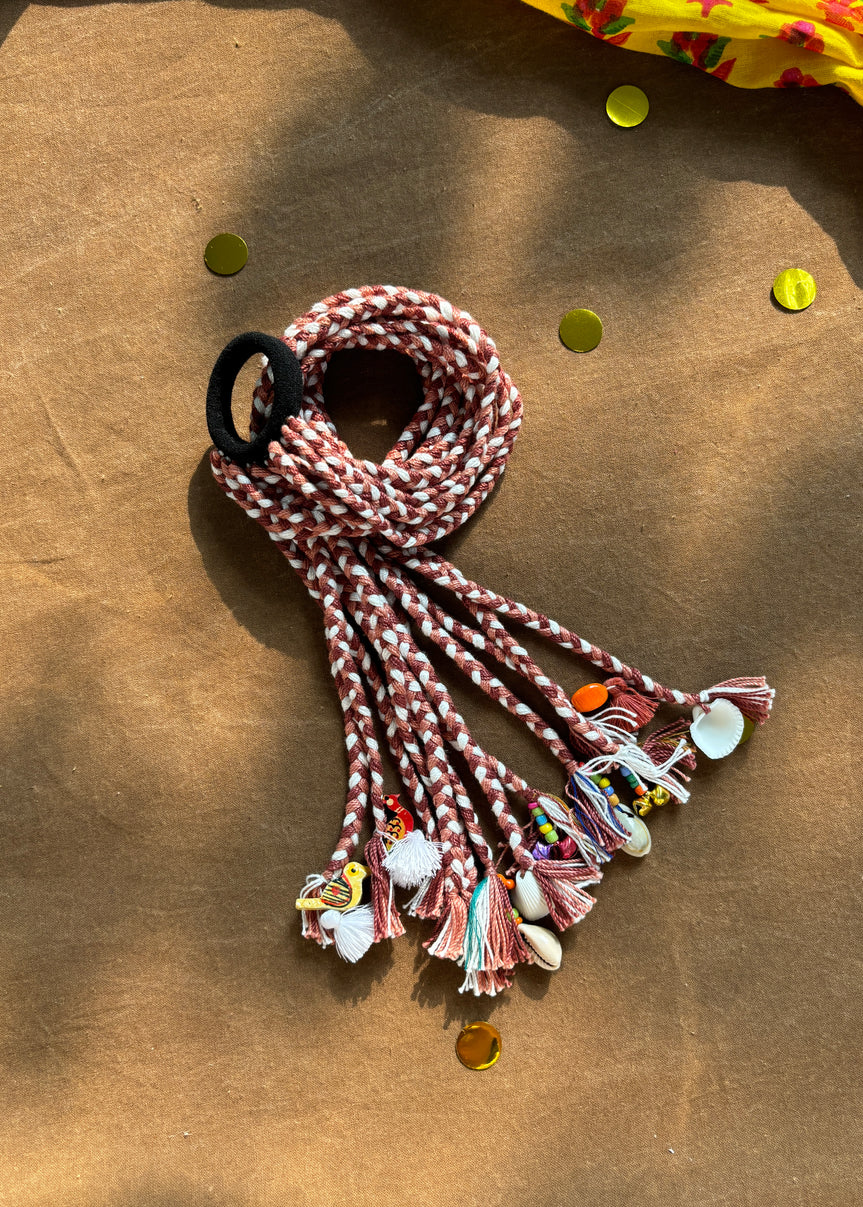 Embrace earthy elegance this Navratri with our brown and white braided hair tuft, featuring delicate tassels and charming ethnic accents.