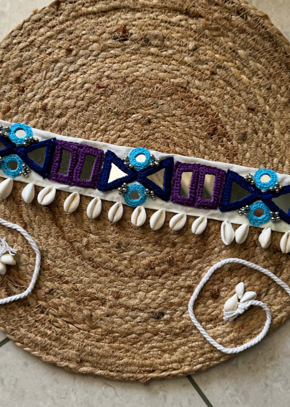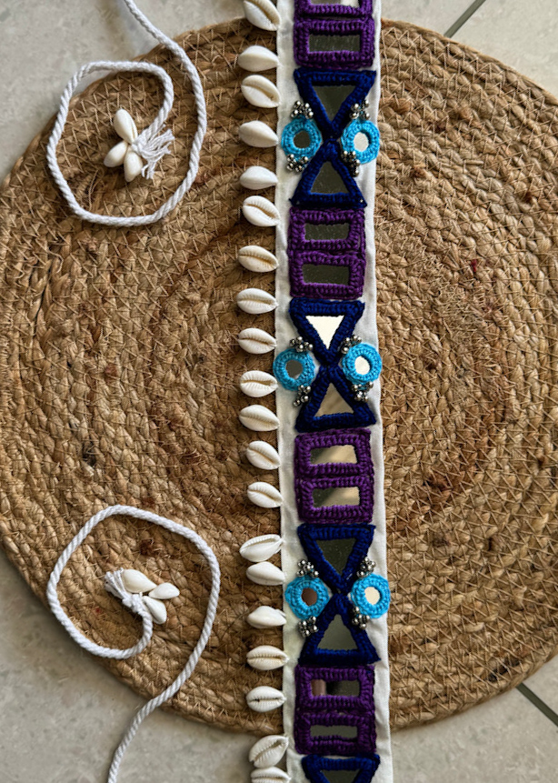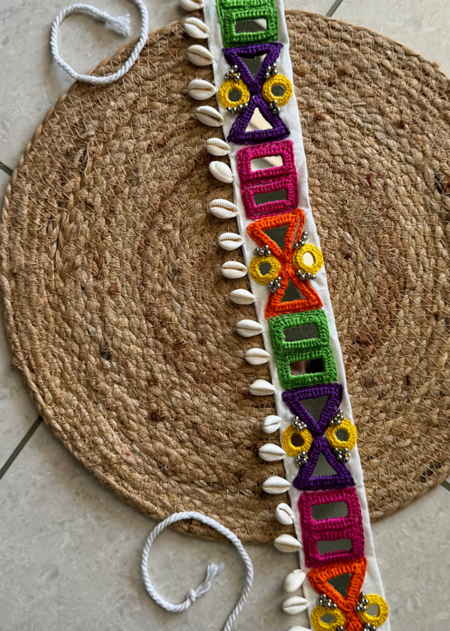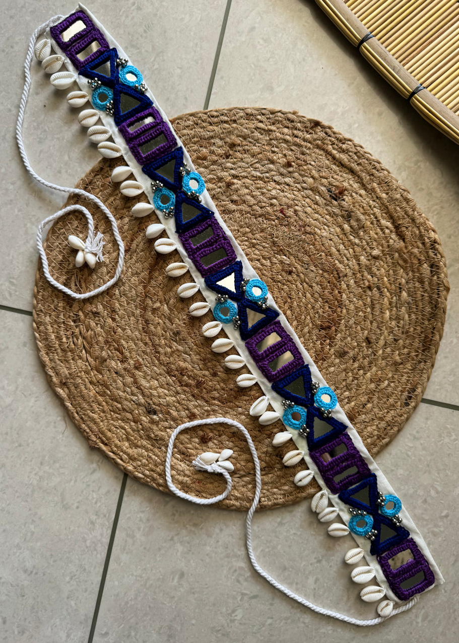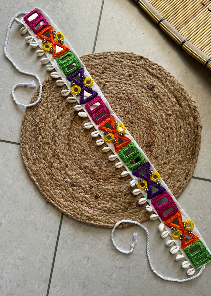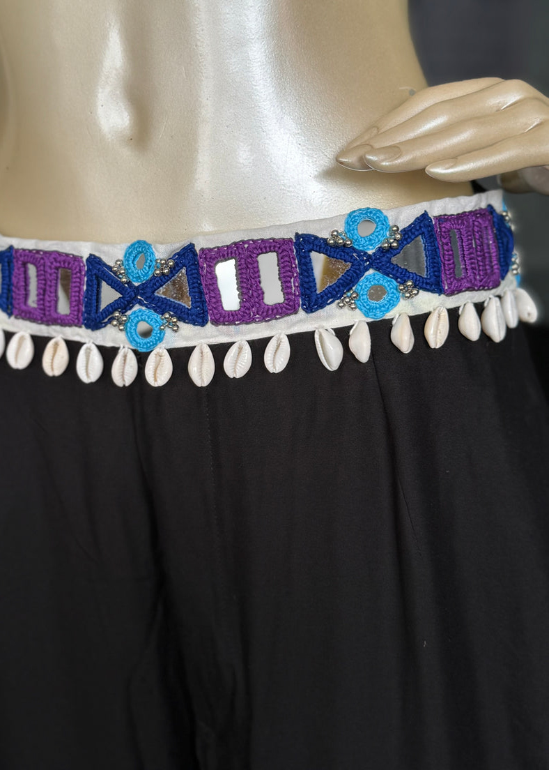 A stunning handcrafted crochet belt, featuring square mirrors and delicate shells, perfect for adding a traditional touch to your attire.