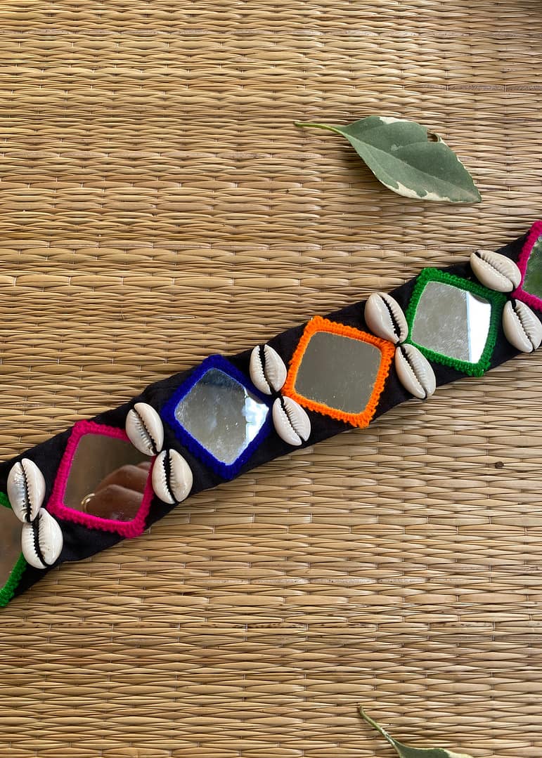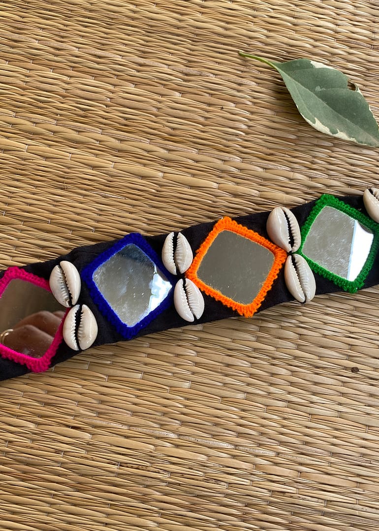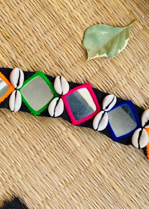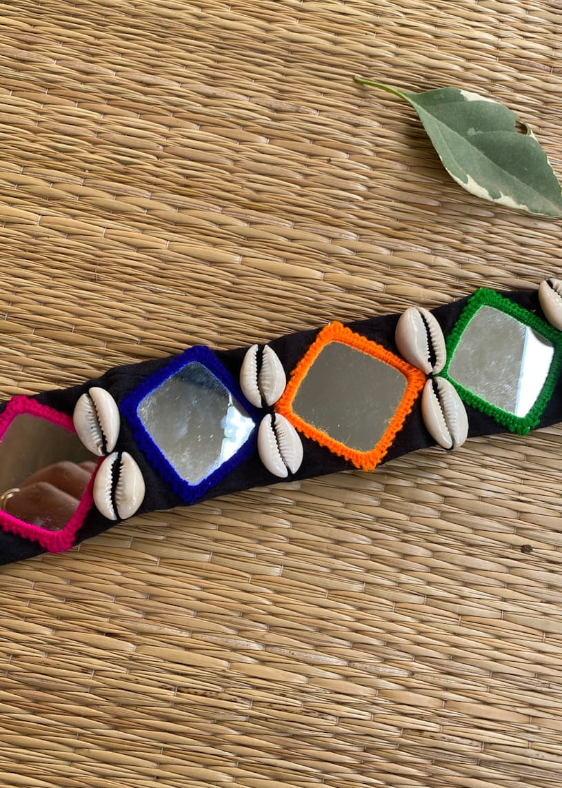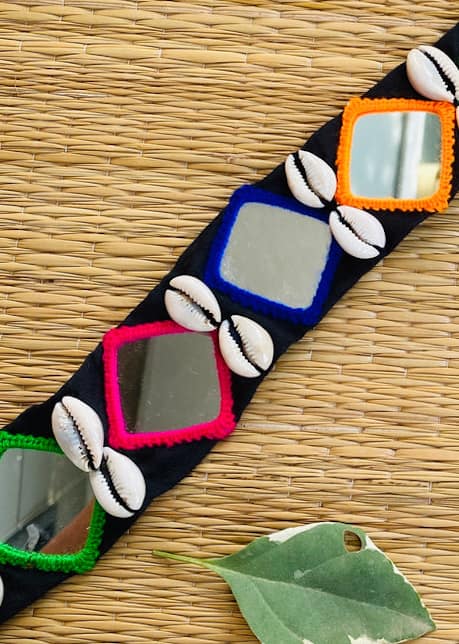 Vibrant handcrafted mirror-thread embroidered belt with decorative shells – add ethnic charm to your waist.