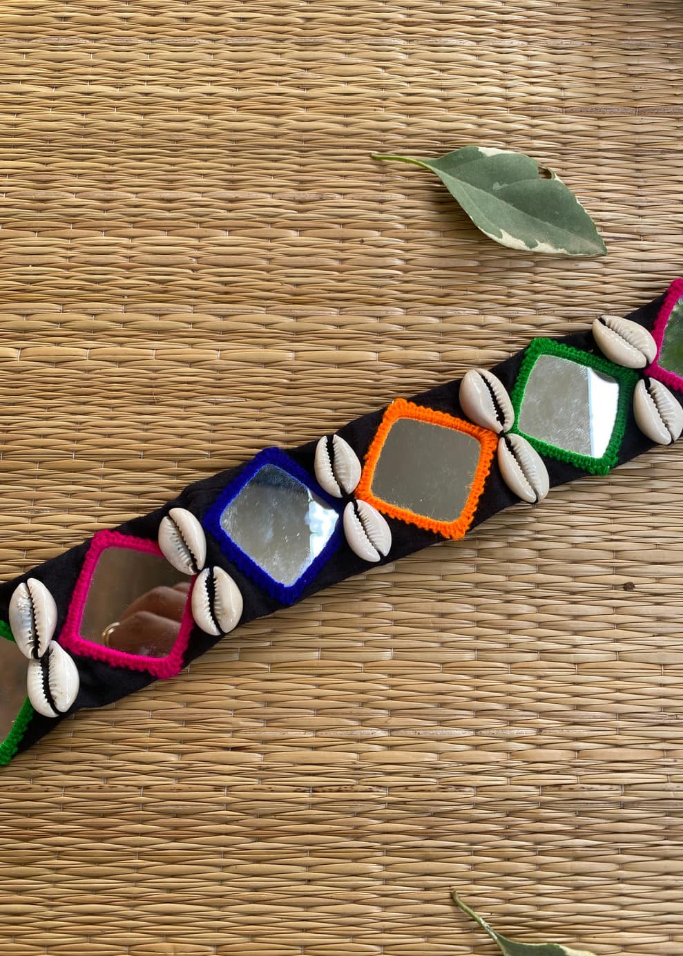 A handcrafted crochet belt with square mirrors and natural shell accents, offering a chic and beach-inspired look.