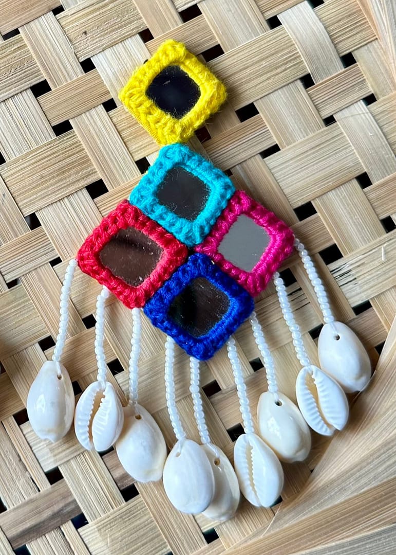 Celebrate the divine grace of Navratri with the Durgakamal Earrings — a vibrant blend of crochet mirror work and cowrie shells, perfect for your festive ensemble.
