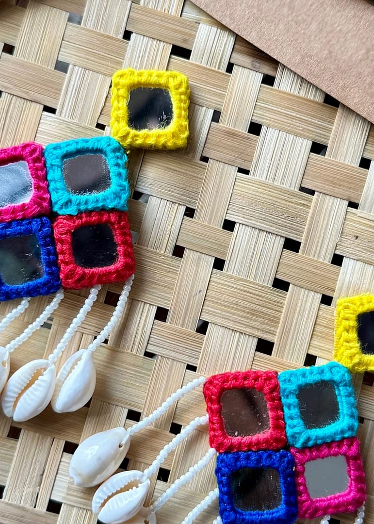 Playful handmade earrings featuring square mirrors, vibrant threadwork, and dangling cowries – a colorful ethnic statement.