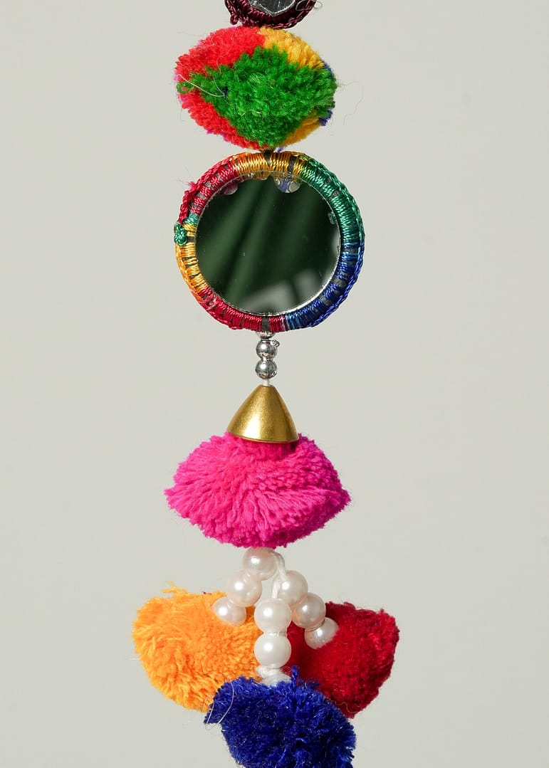 Complete your Garba or Dandiya look with this eye-catching Navratri Latkan (Waist Pendant). Handcrafted with vibrant pom poms, shimmering mirror work, and pearl bead detailing, this latkan adds a playful and festive touch to your traditional attire.