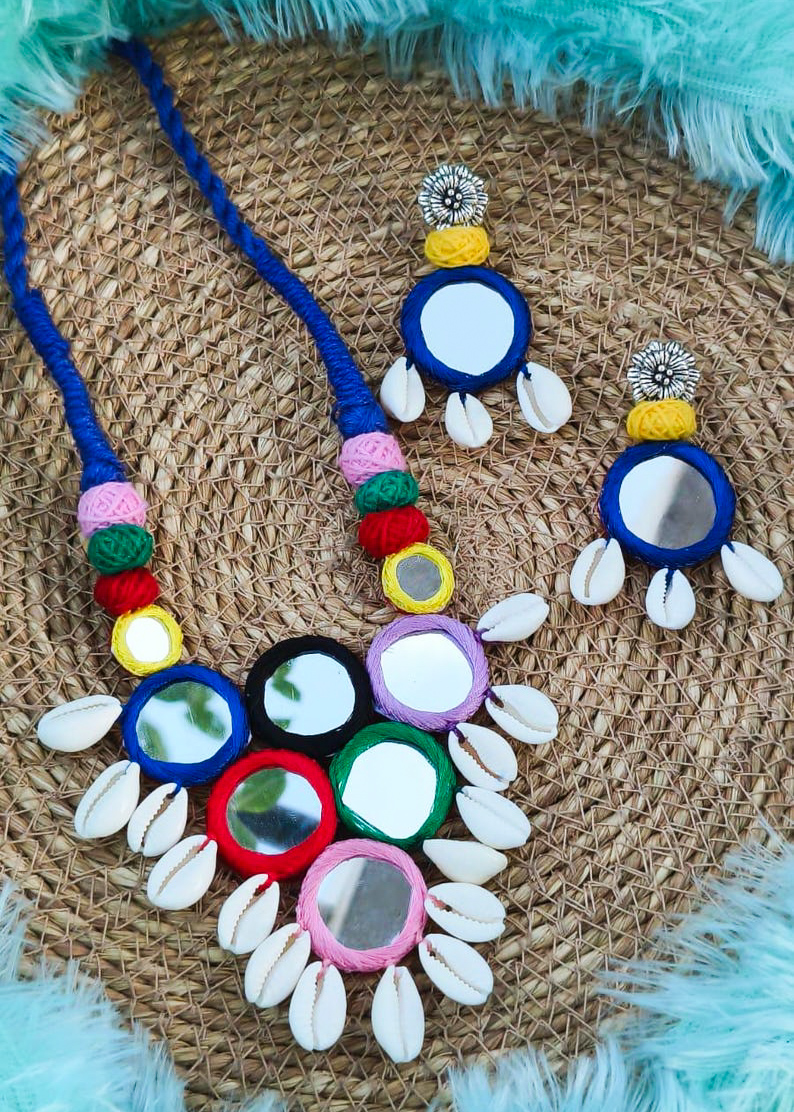 A vibrant handmade choker set adorned with colorful mirror work, crochet detailing, and cowrie shells — bringing you closer to India’s rich tribal and coastal roots.