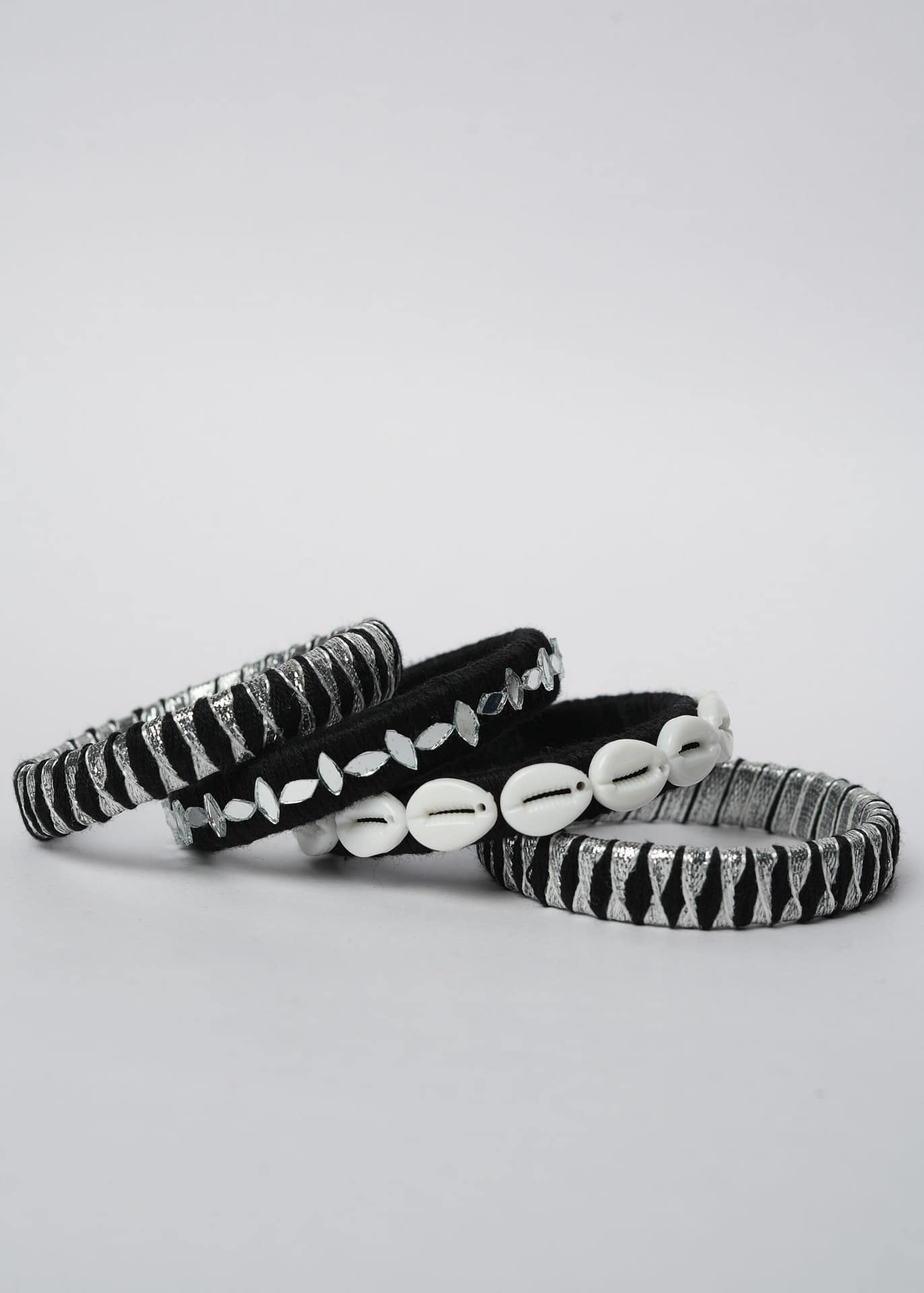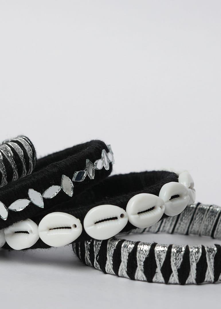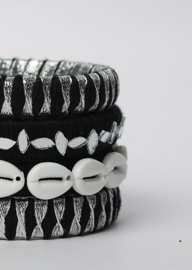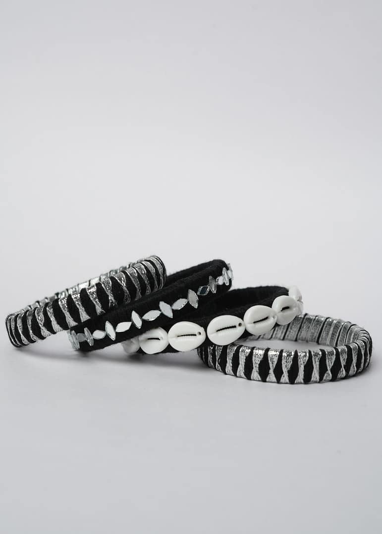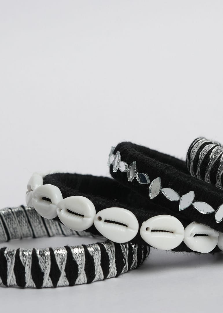 Elevate your festive flair with the Hastkruti “KaariShankha” Handmade Navratri Bangles, a striking set that blends tribal grace with a modern edge. Wrapped in black thread with shimmering silver accents, these bangles are further adorned with hand-sewn mirror pieces and traditional white cowrie shells that reflect heritage with every turn of the wrist.