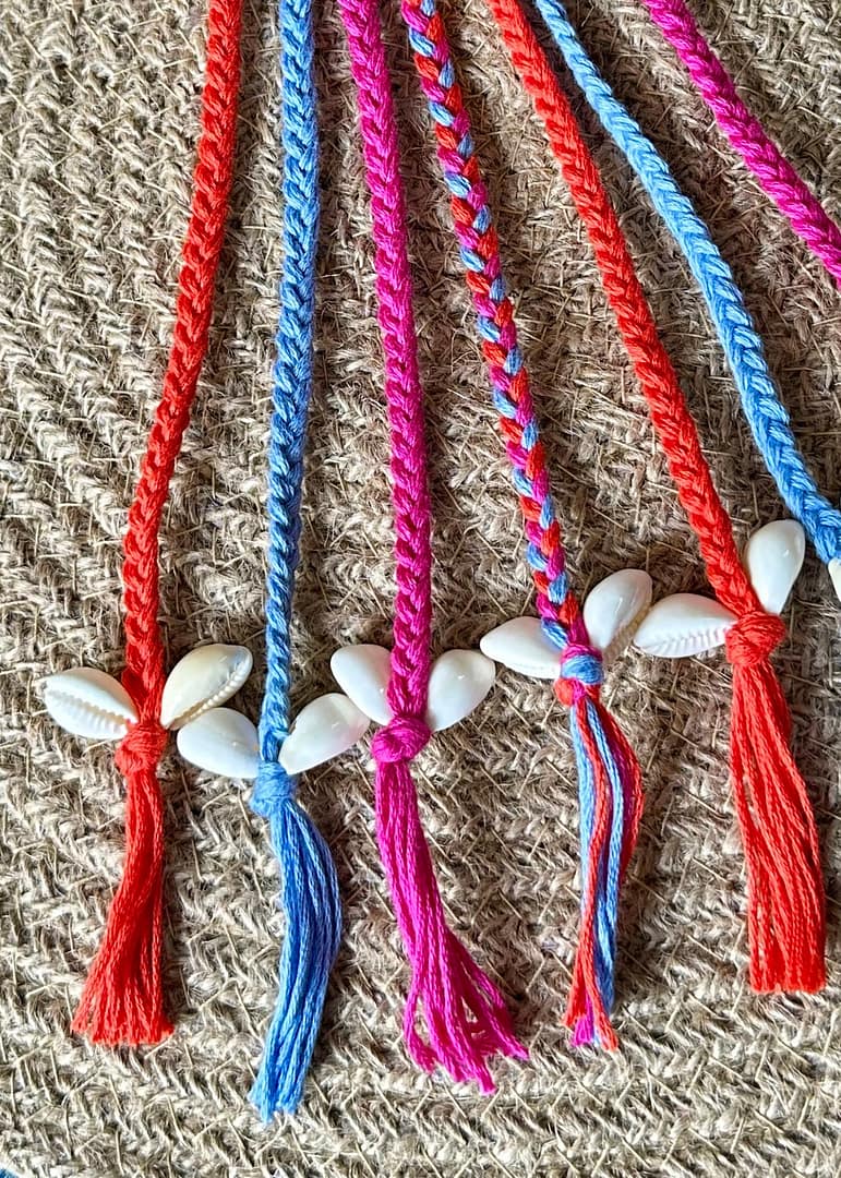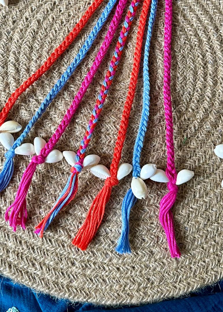 “Laalima”, meaning the beautiful glow of red, represents devotion, energy, and vibrance. This hair tuft blends passionate red with soft pink and cool blue, symbolizing the feminine essence and festive fervor of Navratri. Accentuated with cowrie shells and finished with clean tassels, it adds a graceful swing to every twirl.