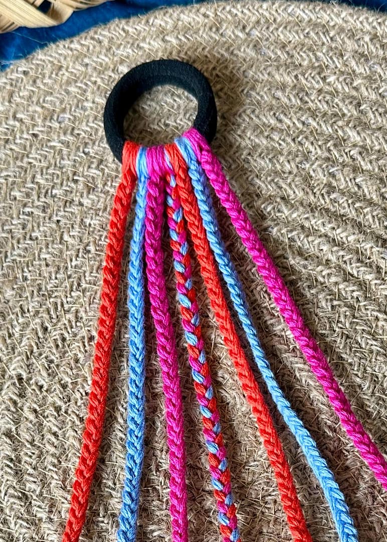 Traditional yet trendy, this teal and pink braided hair tuft with bold blue tassels and shell charms is a Navratri essential.