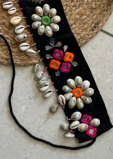 Maduri is a festive masterpiece — a handcrafted choker with vibrant floral motifs, traditional mirror work, and cowrie shells, adding a lively and colorful touch to your Navratri look.