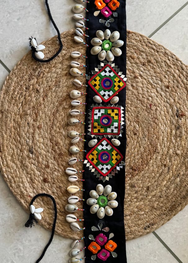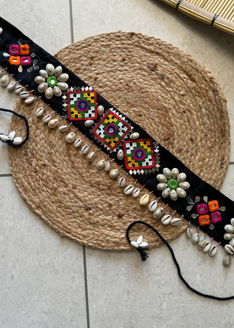A stunning handcrafted crochet belt, featuring square mirrors and delicate shells, perfect for adding a traditional touch to your attire.
