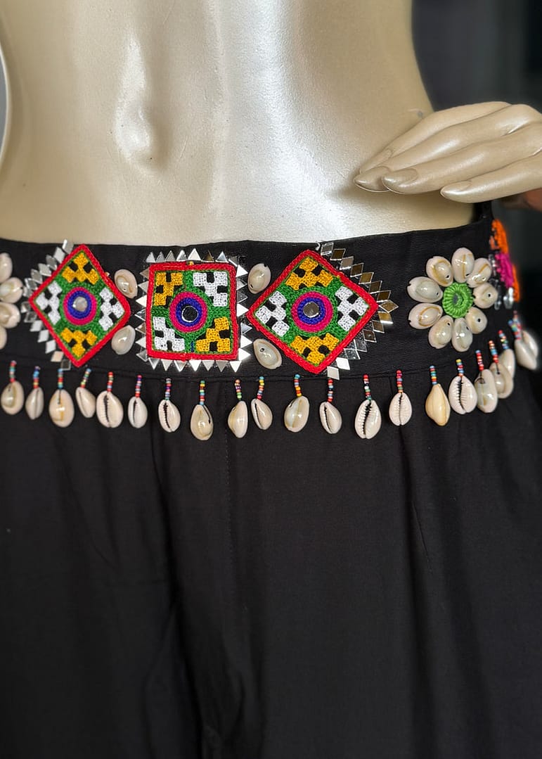 The vibrant threadwork around the mirrors and flowers is complemented by tiny multicolored beads, adding a playful and lively dimension to the piece. Perfect for pairing with your traditional Garba or Dandiya outfit, Madhuri is a blend of modern flair and timeless tradition, making it an essential accessory for your Navratri celebrations.