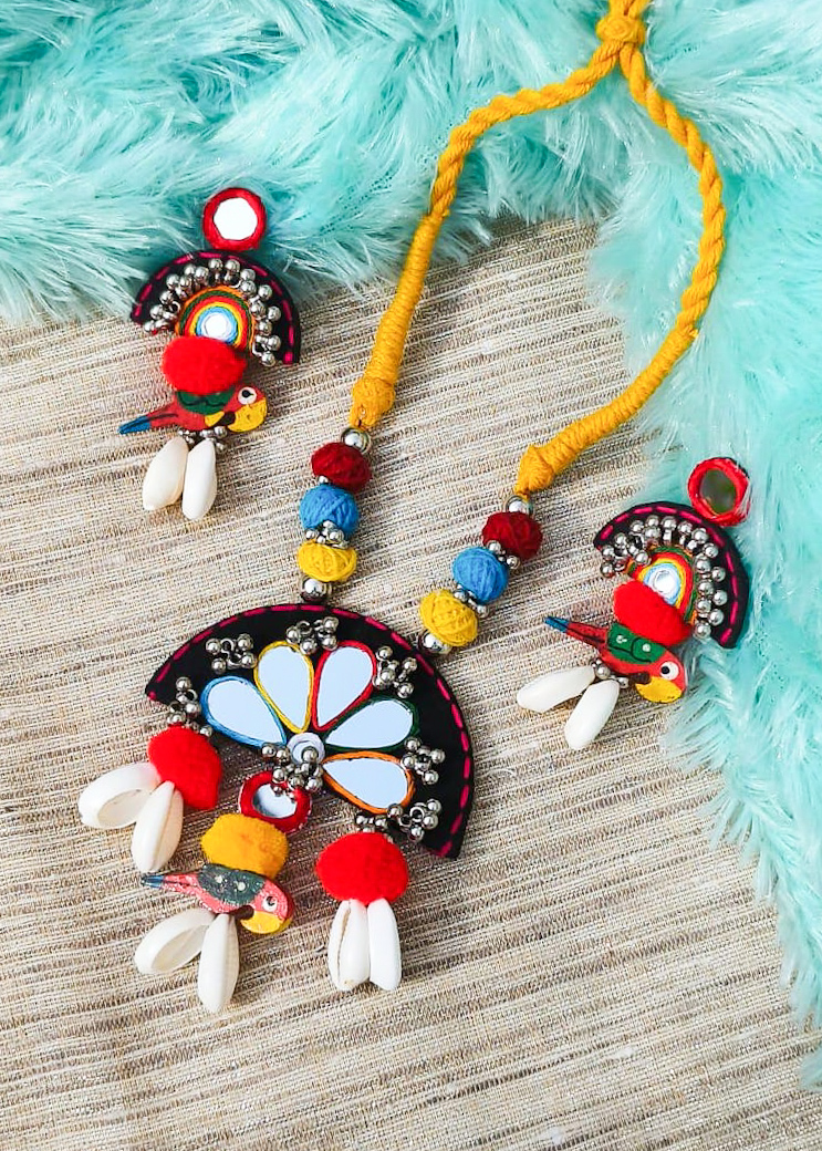 Vibrant handcrafted necklace and earrings set with mirror work, colorful embroidery, and cowrie shell accents – perfect for traditional occasions.