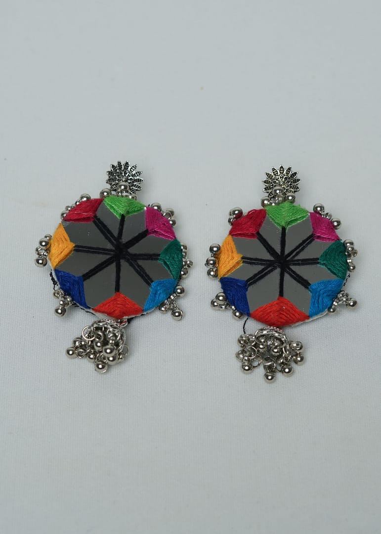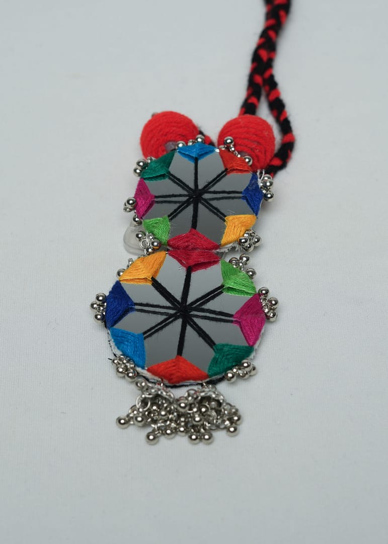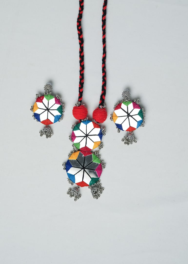 Celebrate tradition and style with our Colorful Mirror Work Tribal Necklace & Earring Set. Each piece is intricately handcrafted with vibrant thread embroidery and small mirror inlays, capturing the essence of Indian tribal artistry. The necklace showcases a striking symmetrical pattern of multicolor mirrors surrounded by tiny silver-tone jhumkas, bringing an authentic ethnic charm.