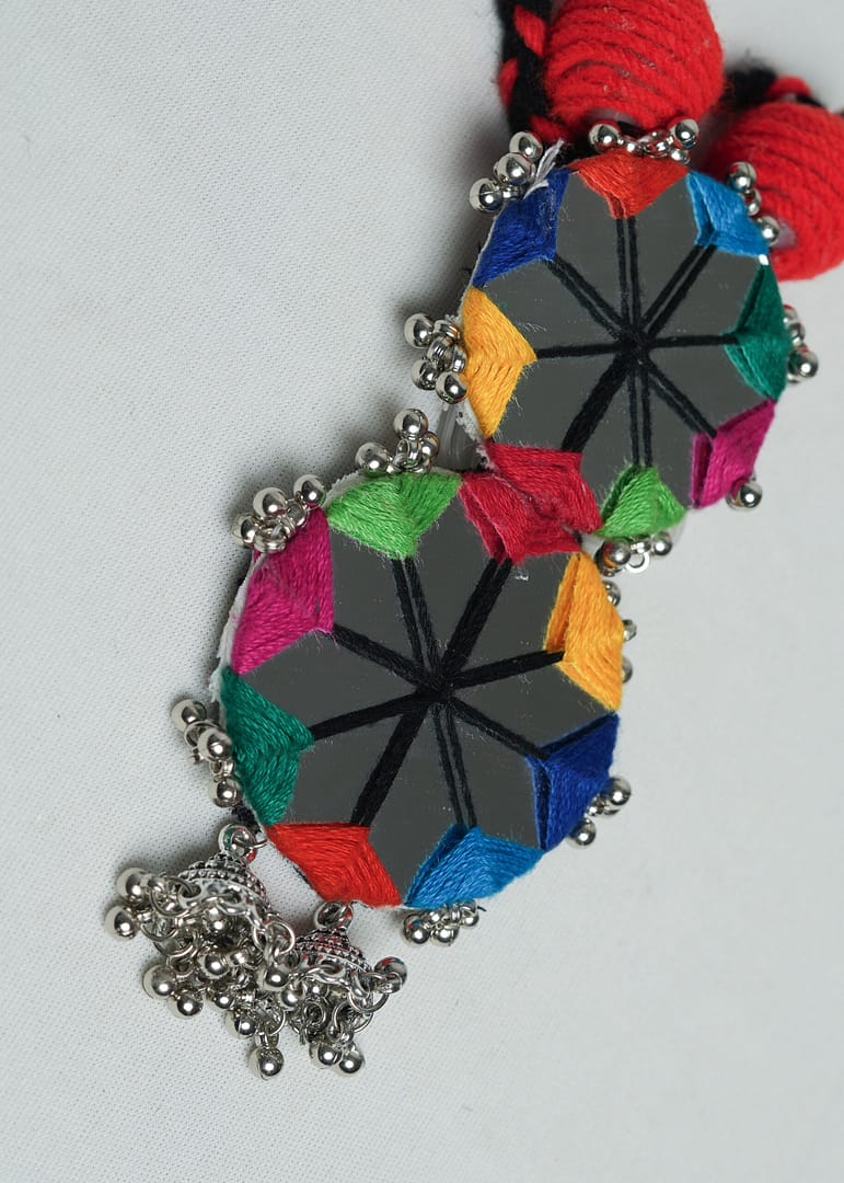Bright and vibrant mirror work tribal necklace paired with matching earrings, adorned with colorful thread and traditional silver-tone jhumkas. Ideal for Navratri and ethnic occasions.