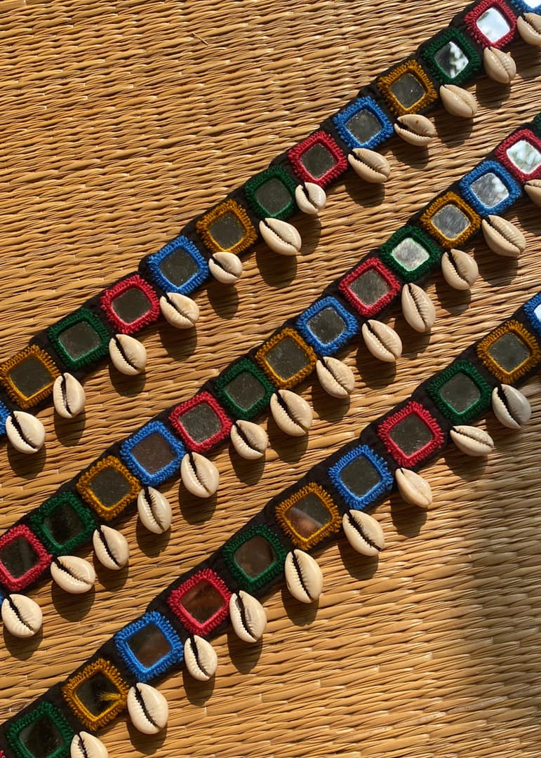 A vibrant handmade choker set adorned with colorful mirror work, crochet detailing, and cowrie shells — bringing you closer to India’s rich tribal and coastal roots.