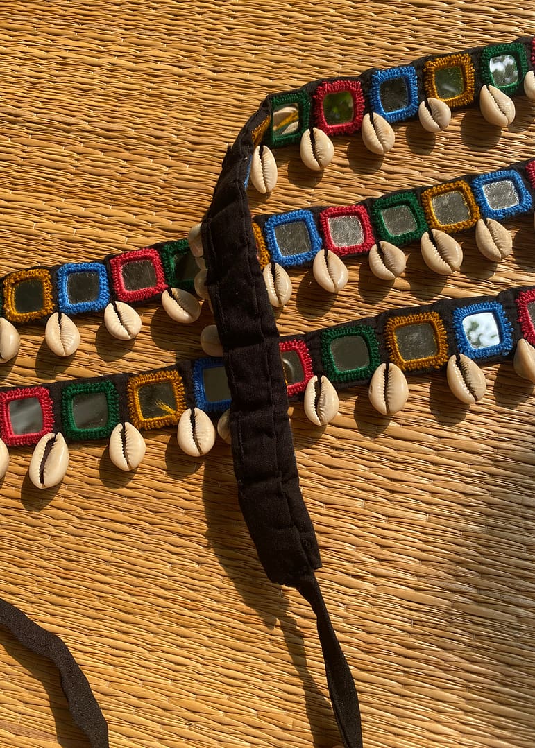 A stunning handcrafted crochet belt, featuring square mirrors and delicate shells, perfect for adding a traditional touch to your attire.