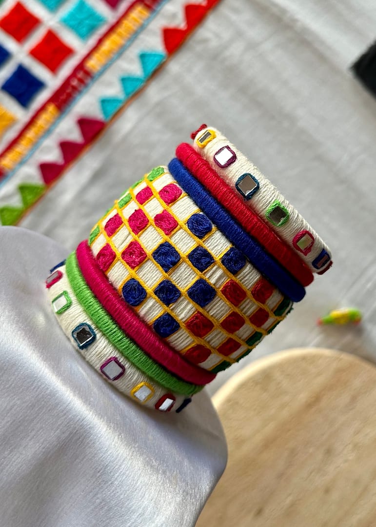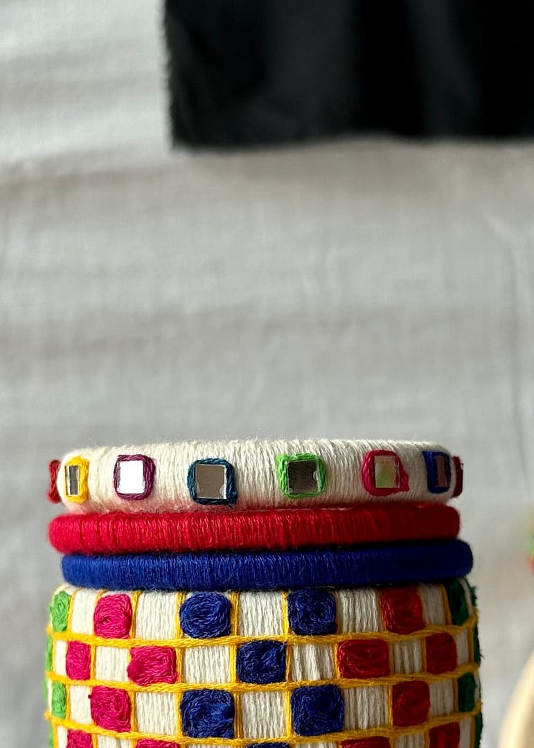 The Nilam bangle set is a vibrant fusion of tradition and geometric style. Featuring a harmonious mix of red, blue, yellow, and green threads intricately wrapped and decorated with colorful square accents, this bangle set is a visual treat. Each bangle is meticulously crafted with bright, festive colors to capture the energetic spirit of Navratri. Perfect for your Garba nights or any ethnic celebration, Nilam adds a playful yet regal touch to your outfit, embodying the essence of colorful celebrations with a modern twist.