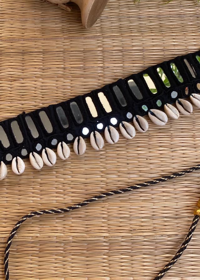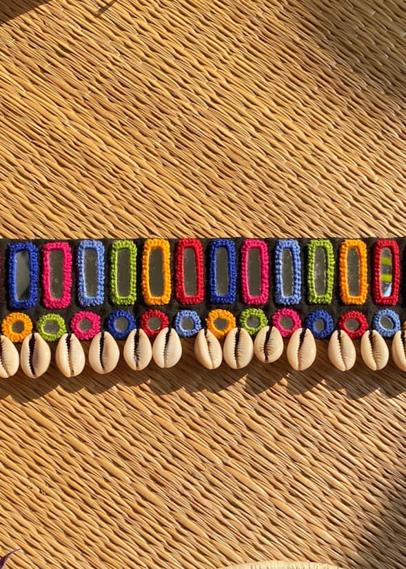 Vibrant handcrafted mirror-thread embroidered belt with decorative shells – add ethnic charm to your waist.