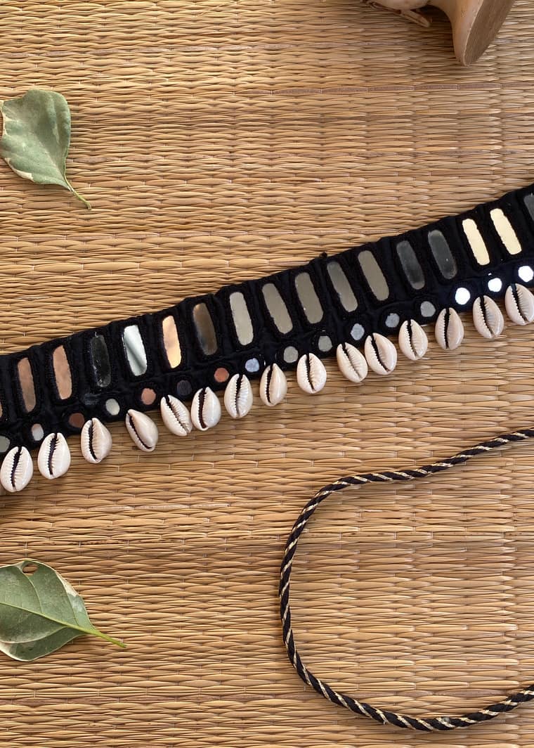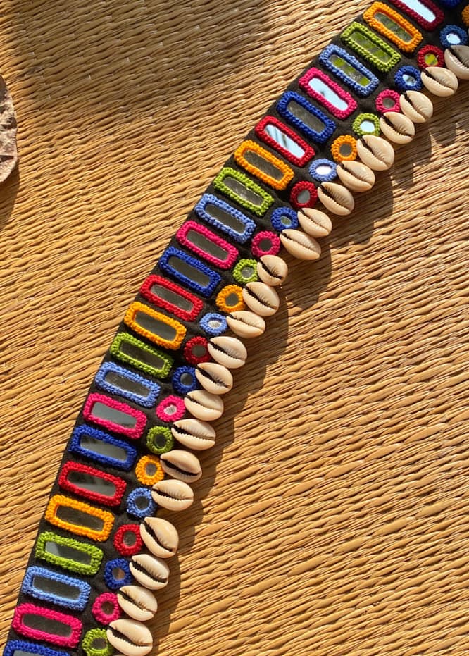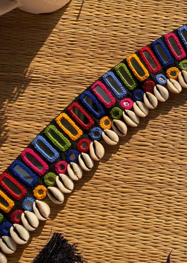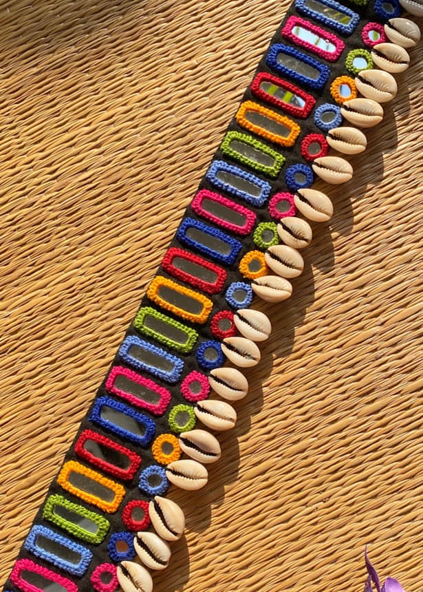 A vibrant handmade choker set adorned with colorful mirror work, crochet detailing, and cowrie shells — bringing you closer to India’s rich tribal and coastal roots.