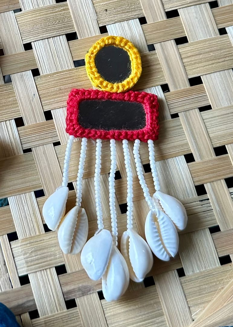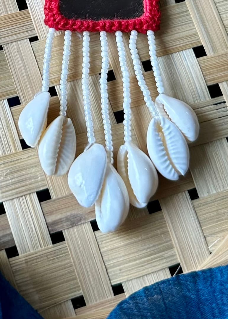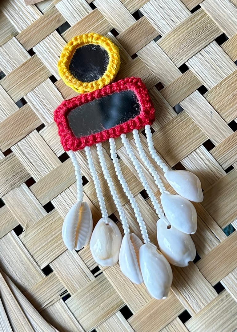 The Radhedurga Earrings are a tribute to the fierce and feminine energy of Goddess Durga, combined with the playful elegance of Radha. Featuring a striking yellow and red color palette, these earrings showcase a round and rectangular mirror encased in hand-crocheted threadwork. Long beaded strands cascade down with dangling cowrie shells, adding movement, charm, and earthy elegance.