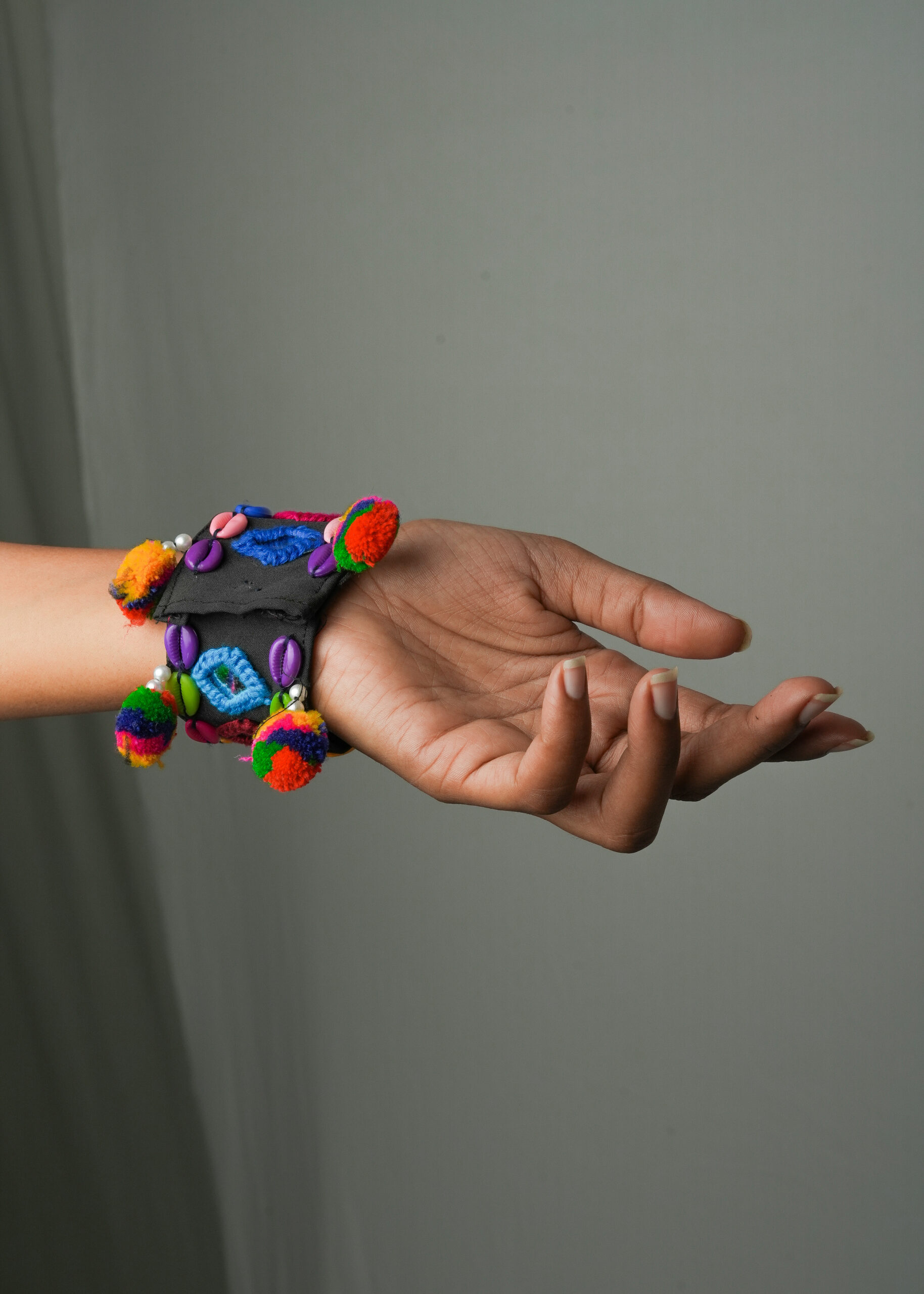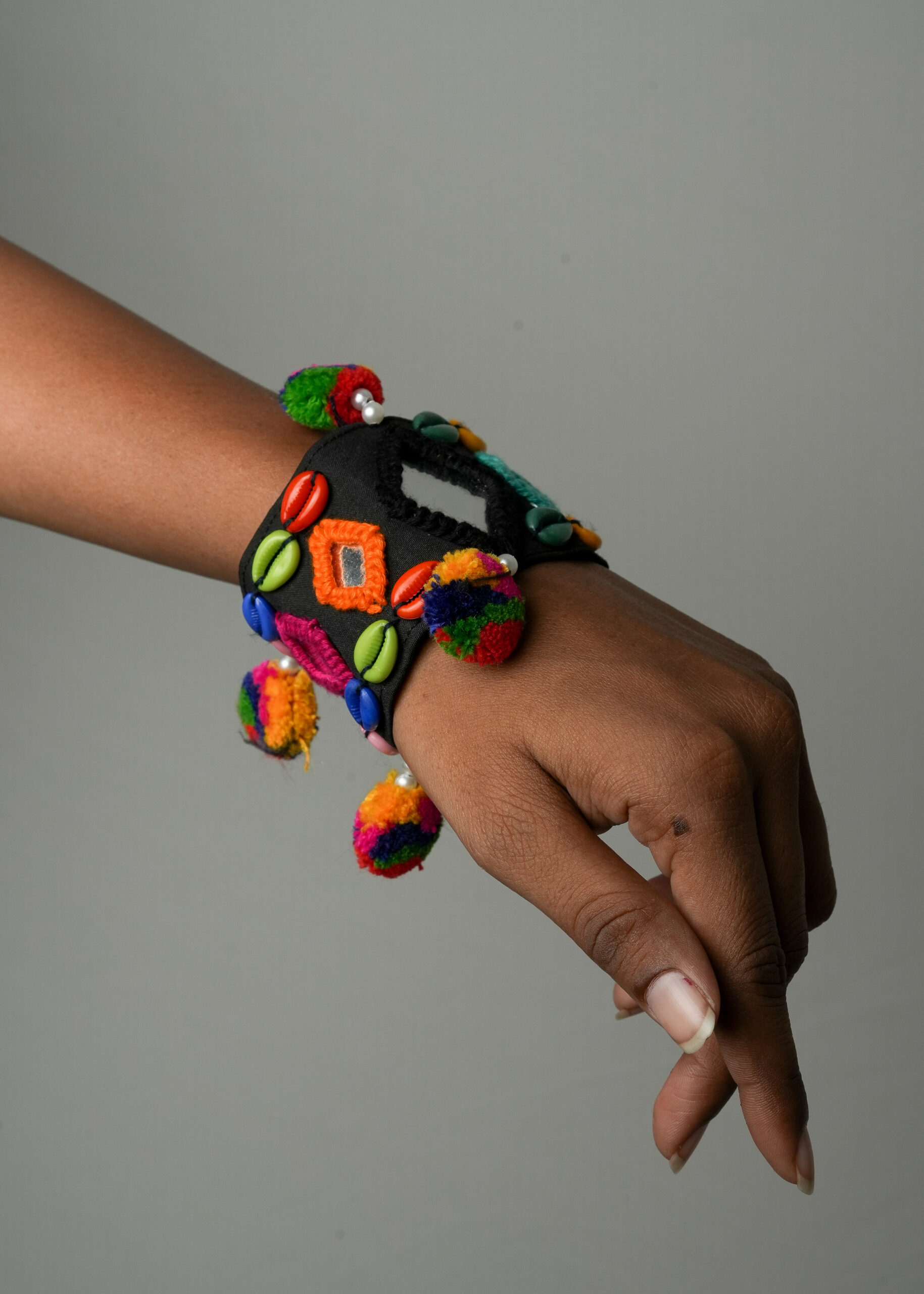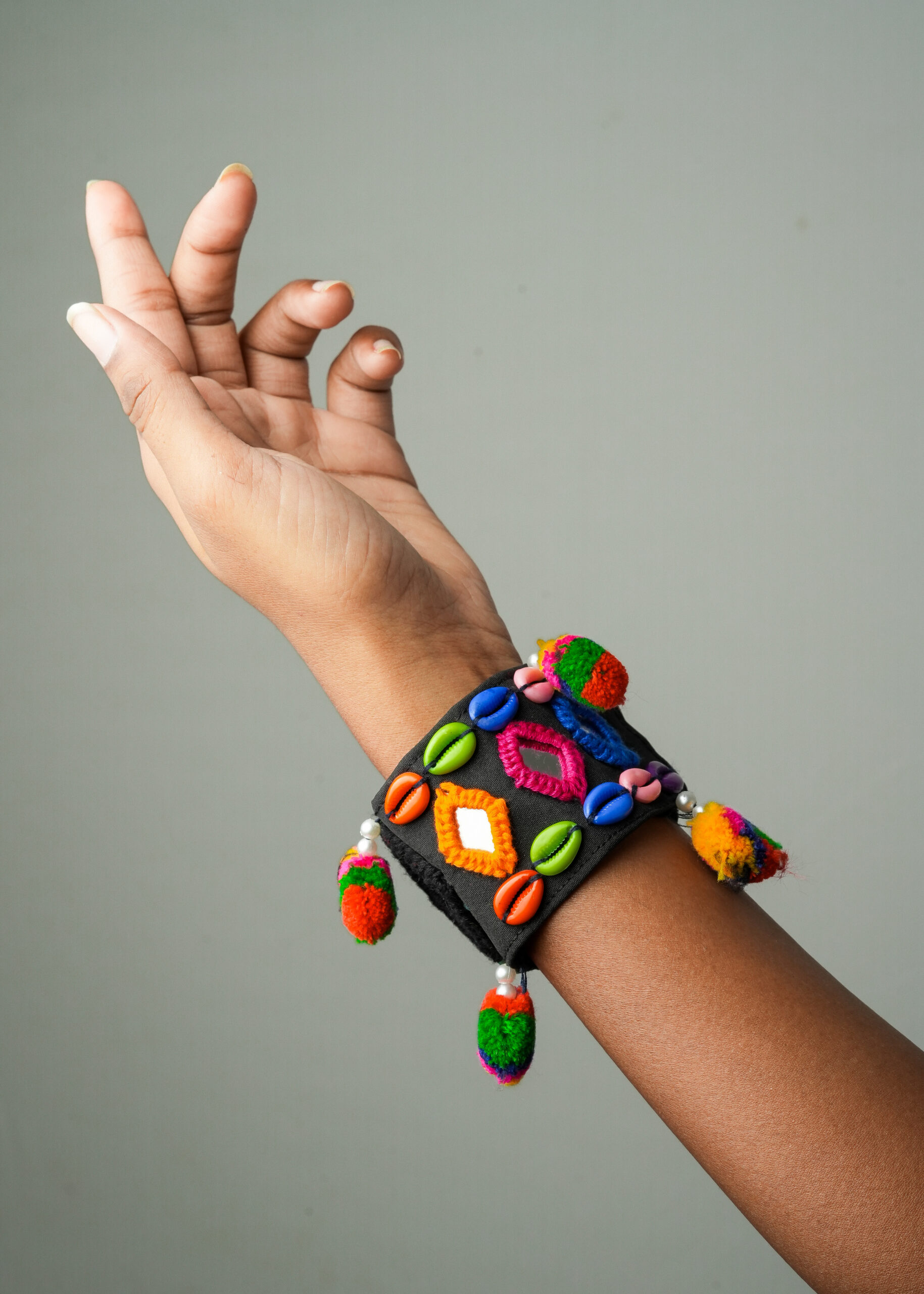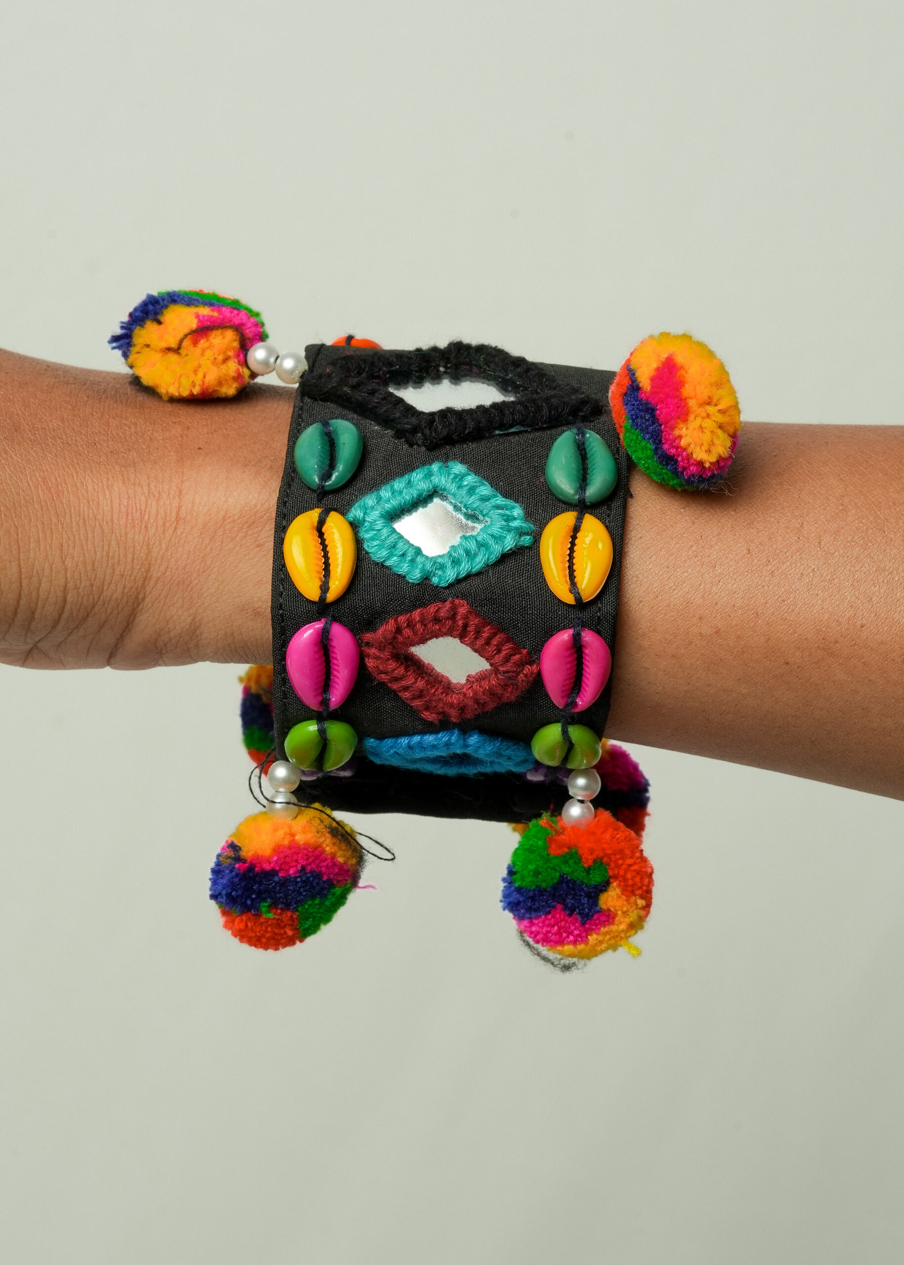 Handcrafted ethnic hand cuff designed for Navratri celebrations, adorned with colorful pom-poms, mirrors, and traditional threadwork to elevate your festive look.