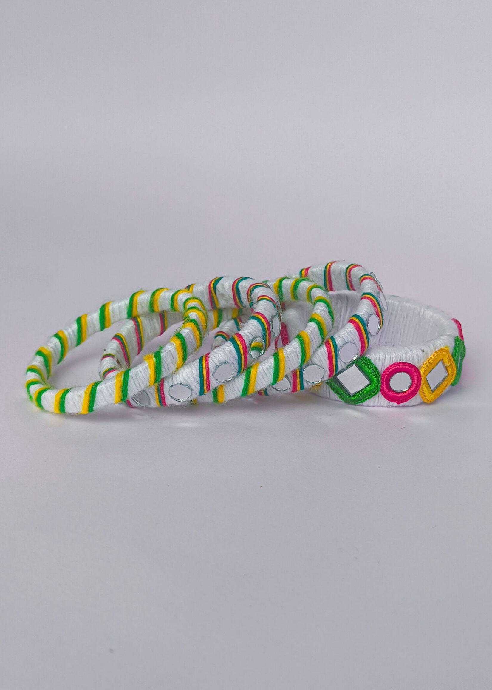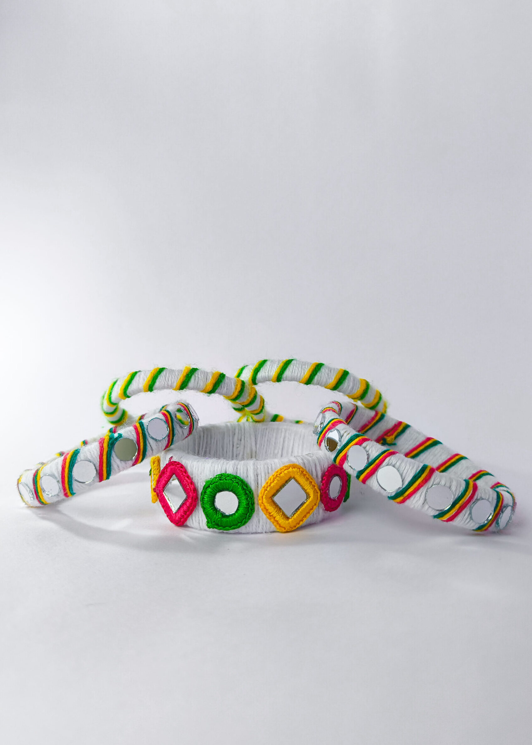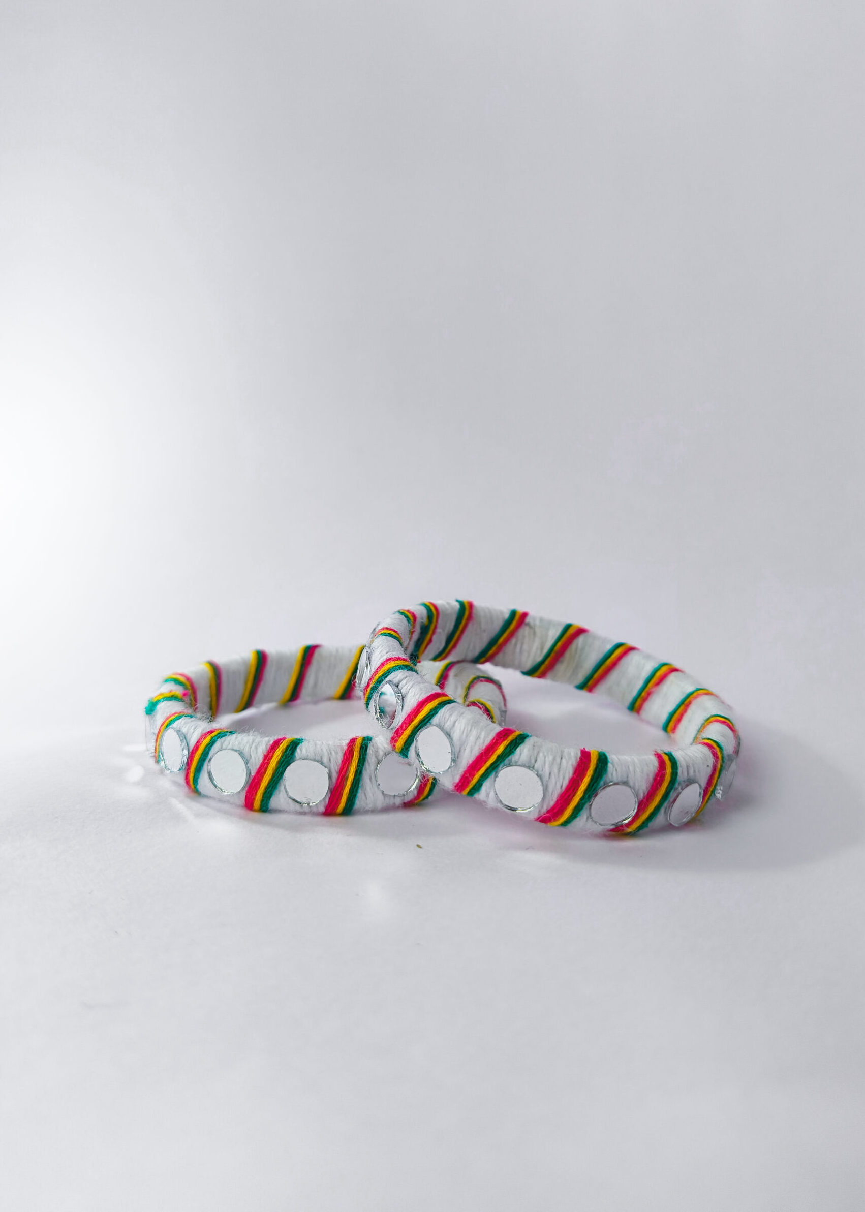 Celebrate the vibrant spirit of Navratri with our Rangili Raas Bangdi, a set of handcrafted bangles designed to bring out the festive charm in every twirl of Garba and Dandiya. Carefully wrapped in colorful threads of white, yellow, green, and pink, these bangles are further adorned with tiny mirror embellishments that catch the light beautifully, adding sparkle to your every move. The traditional geometric designs symbolize joy and energy, making them the perfect accessory for the season of devotion and dance.