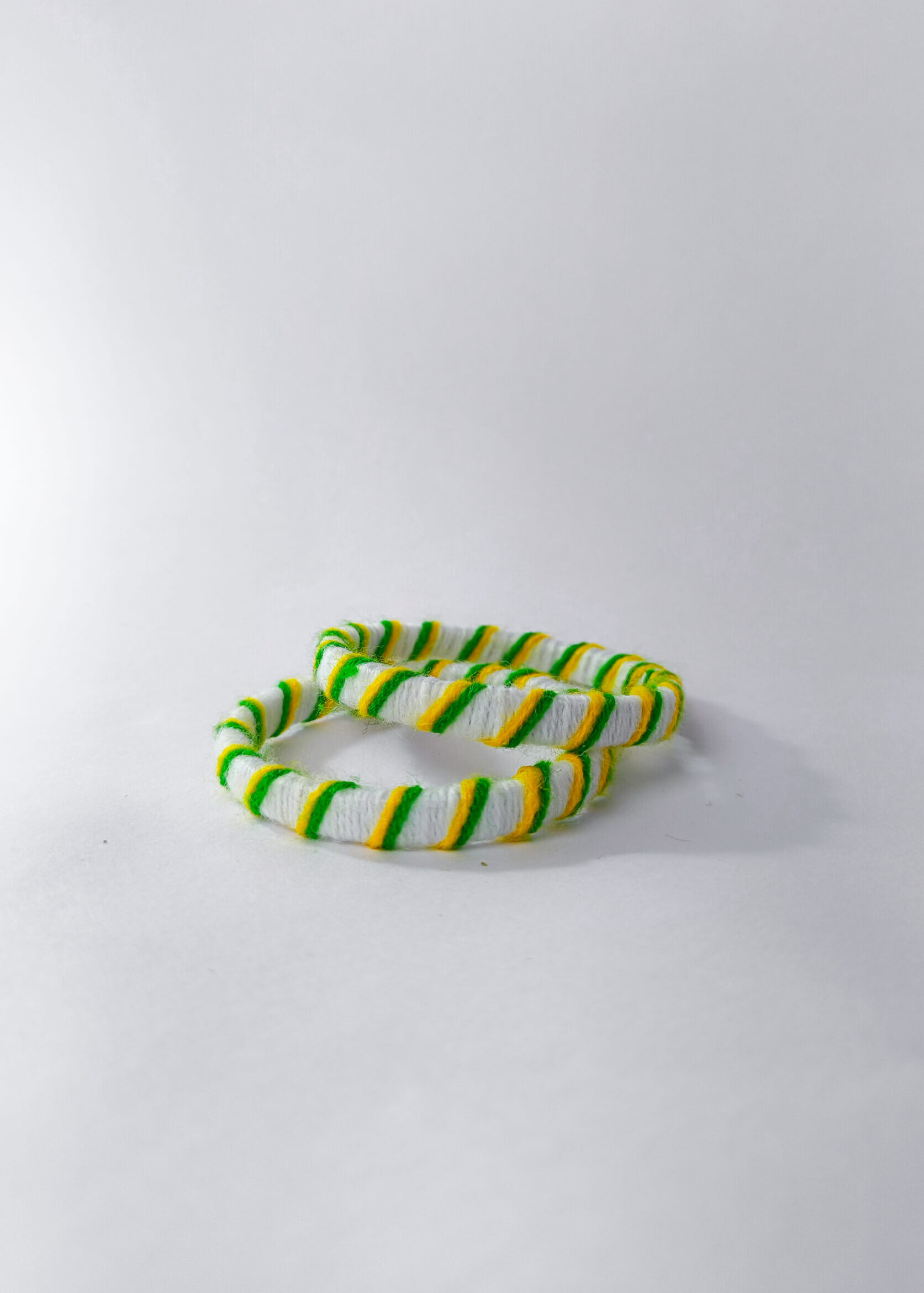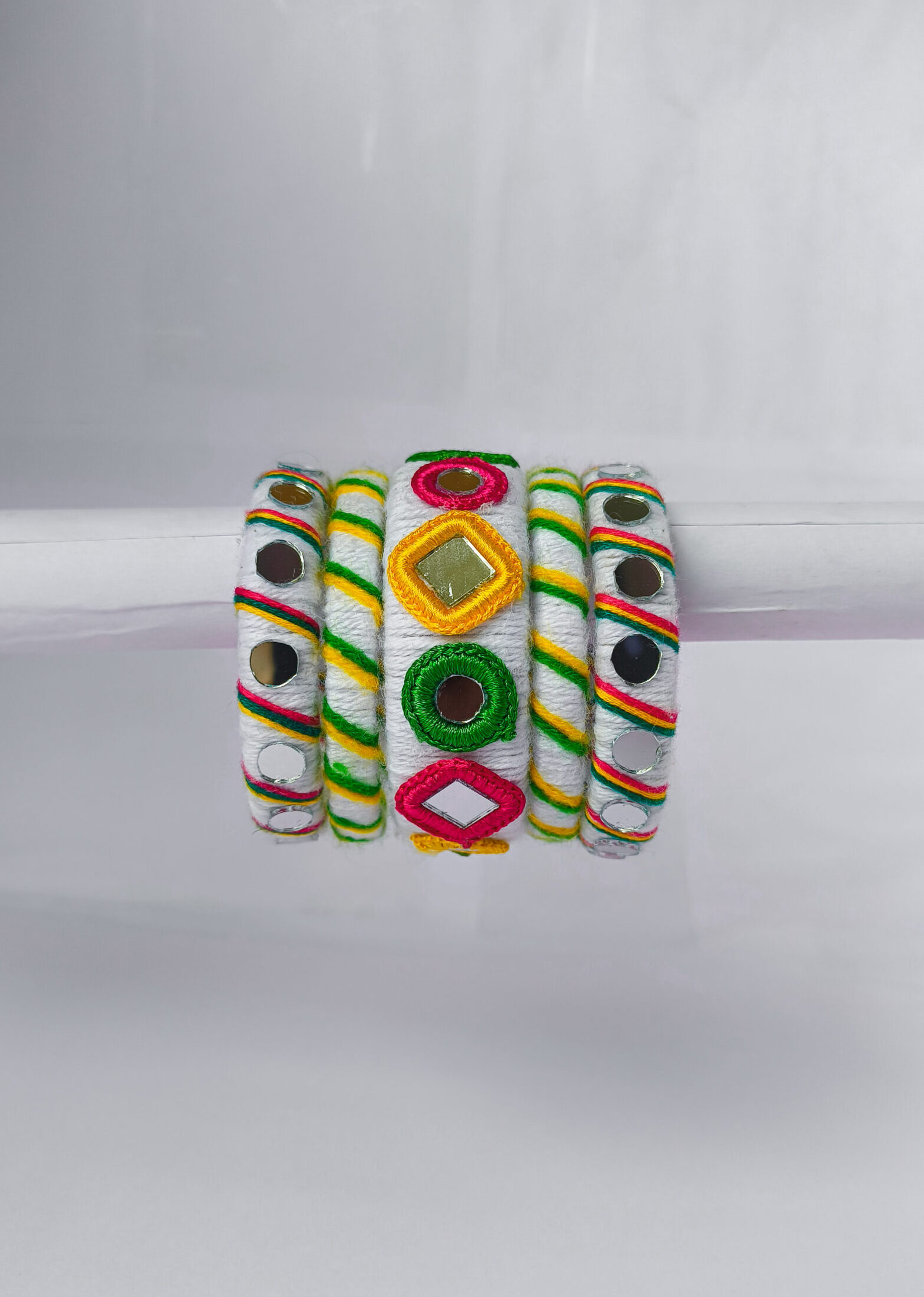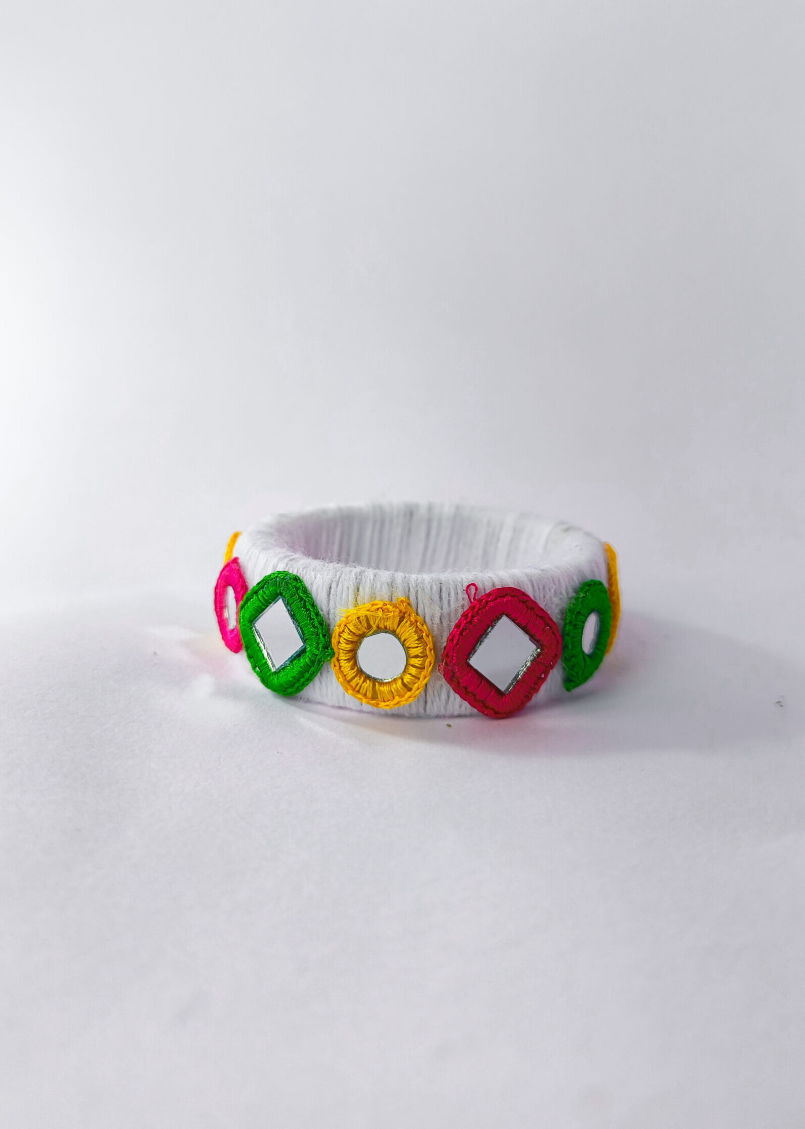 Celebrate the vibrant spirit of Navratri with our Rangili Raas Bangdi, a set of handcrafted bangles designed to bring out the festive charm in every twirl of Garba and Dandiya. Carefully wrapped in colorful threads of white, yellow, green, and pink, these bangles are further adorned with tiny mirror embellishments that catch the light beautifully, adding sparkle to your every move. The traditional geometric designs symbolize joy and energy, making them the perfect accessory for the season of devotion and dance.