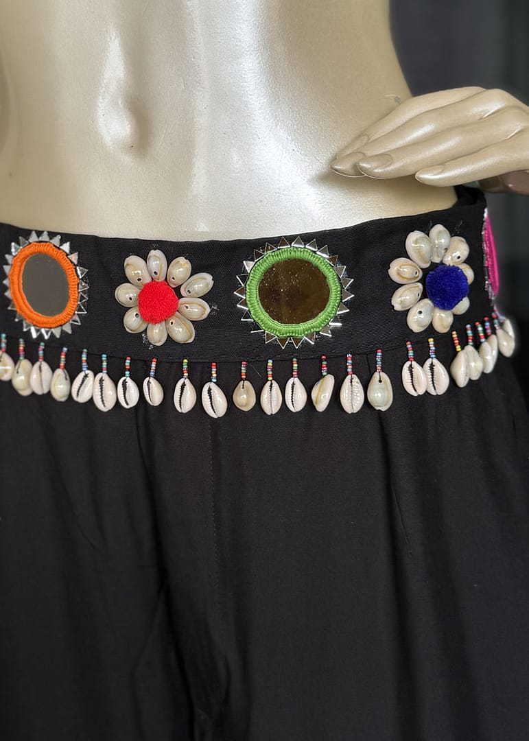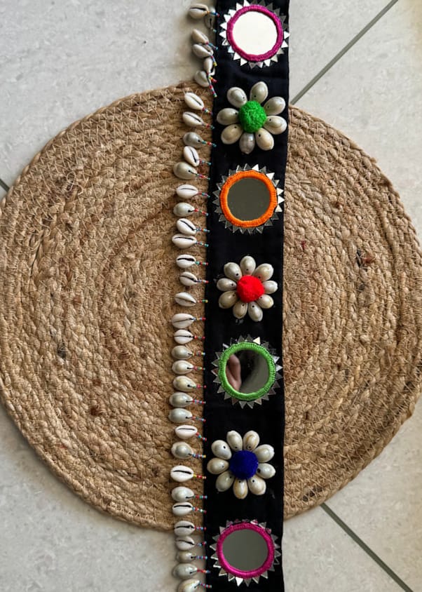Celebrate every step of your dance in colour and tradition. The Trikon NrityaKavach is a handcrafted waist belt featuring triangle mirror embroidery, radiant threads, and sacred cowrie shells — a perfect companion for your Navratri and folk dance ensembles.