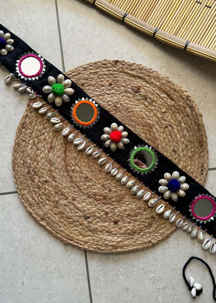 Rangoli is a beautiful celebration of colors and traditional craftsmanship. This stunning handcrafted choker features an array of bright mirrors framed by colorful threadwork, surrounded by charming flower motifs. The addition of natural cowrie shells along the base enhances the festive vibe, making it the perfect accessory for Garba or Dandiya nights during Navratri.