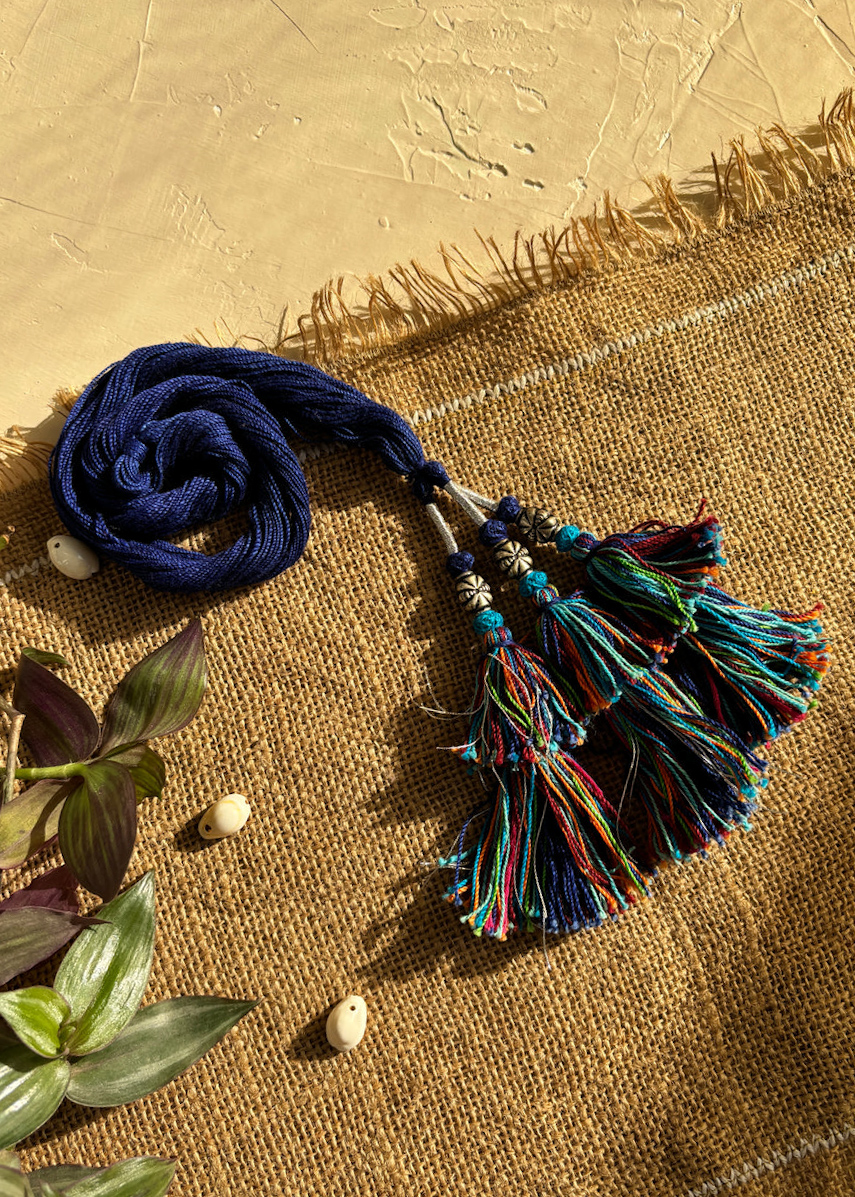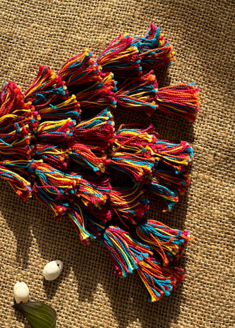 Step into the timeless elegance of Indian tradition with our Rangrez – Tradition Parandi, a masterpiece inspired by the sacred reds of bridal rituals and temple festivities. Woven in rich maroon threads, the parandi cascades into multiple tiers of vibrant, multicoloured tassels—each knot tied with devotion and heritage. The silver cone embellishments at the top enhance its regal charm, while the intricate craftsmanship celebrates the spirit of womanhood and festivity.