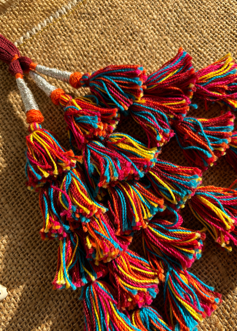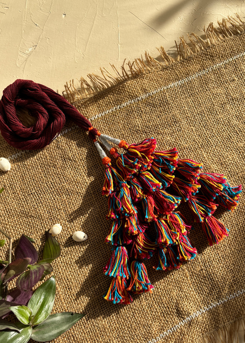 Woven in rich maroon threads, the parandi cascades into multiple tiers of vibrant, multicoloured tassels—each knot tied with devotion and heritage. The silver cone embellishments at the top enhance its regal charm, while the intricate craftsmanship celebrates the spirit of womanhood and festivity.