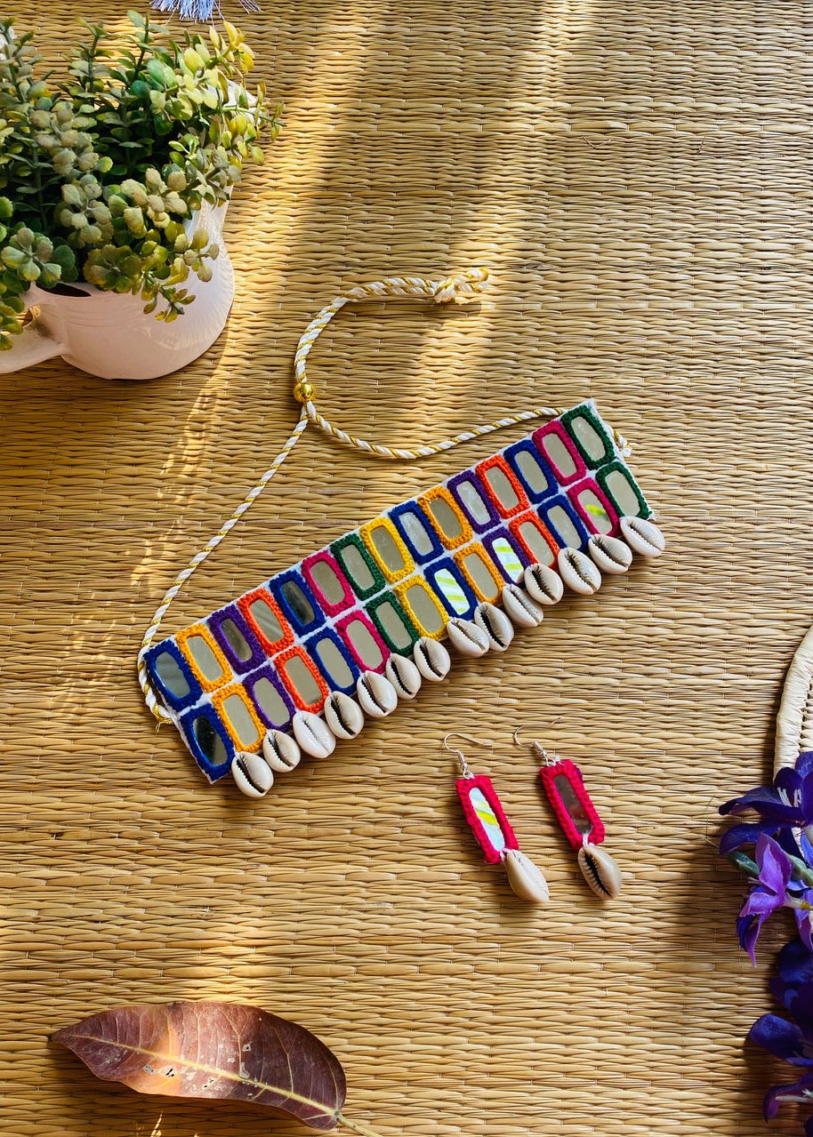 Vibrant handcrafted necklace and earrings set with mirror work, colorful embroidery, and cowrie shell accents – perfect for traditional occasions.