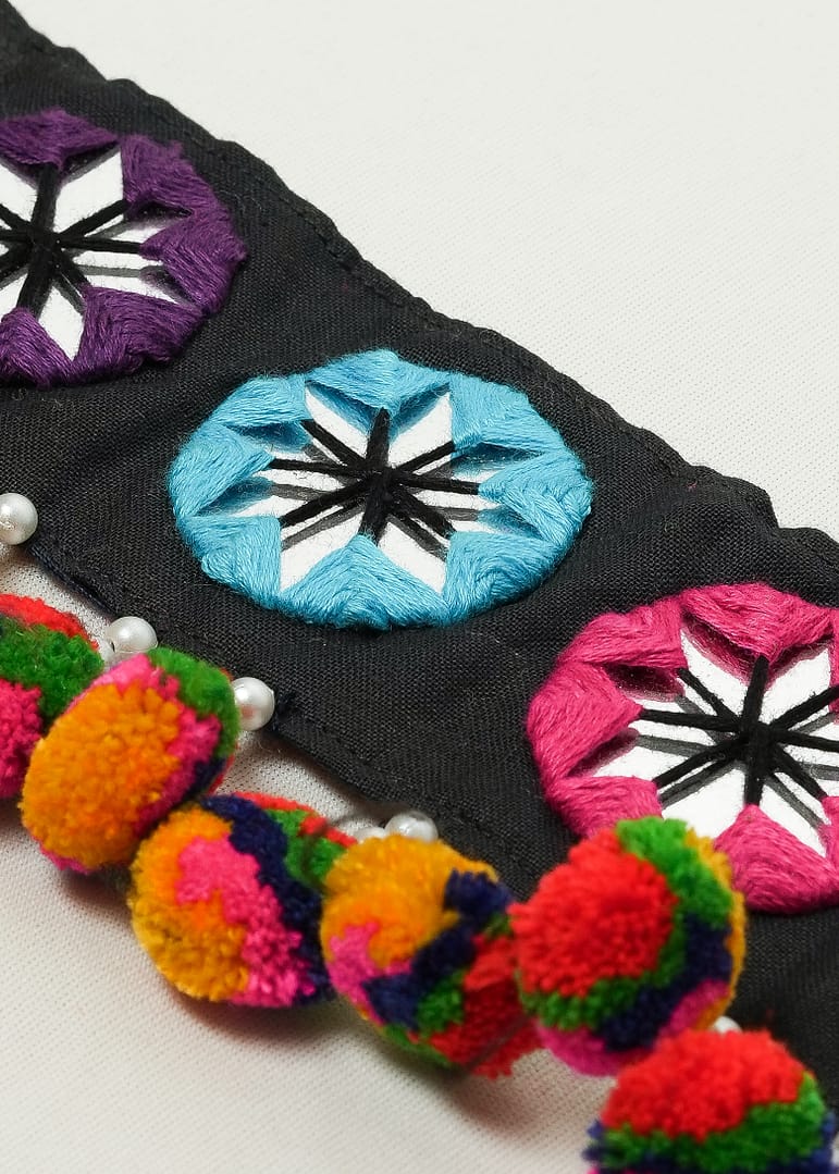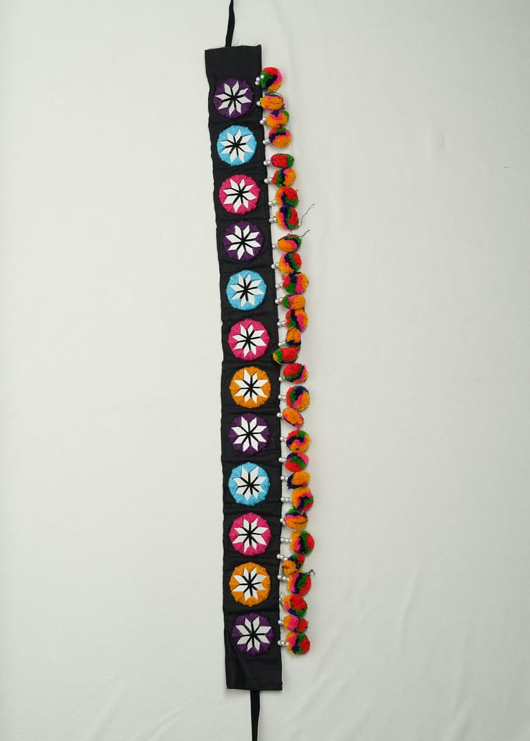 Celebrate the spirit of Navratri with the vibrant charm of Hastkruti’s “RangTarang” Handmade Kamarbandh. Handcrafted with love and rooted in tradition, this waist belt is adorned with intricate thread embroidery, sparkling mirror work, and playful multicolor pompoms that sway with your every move. Each element is carefully hand-stitched by local artisans, reflecting the rich cultural essence of Gujarat.