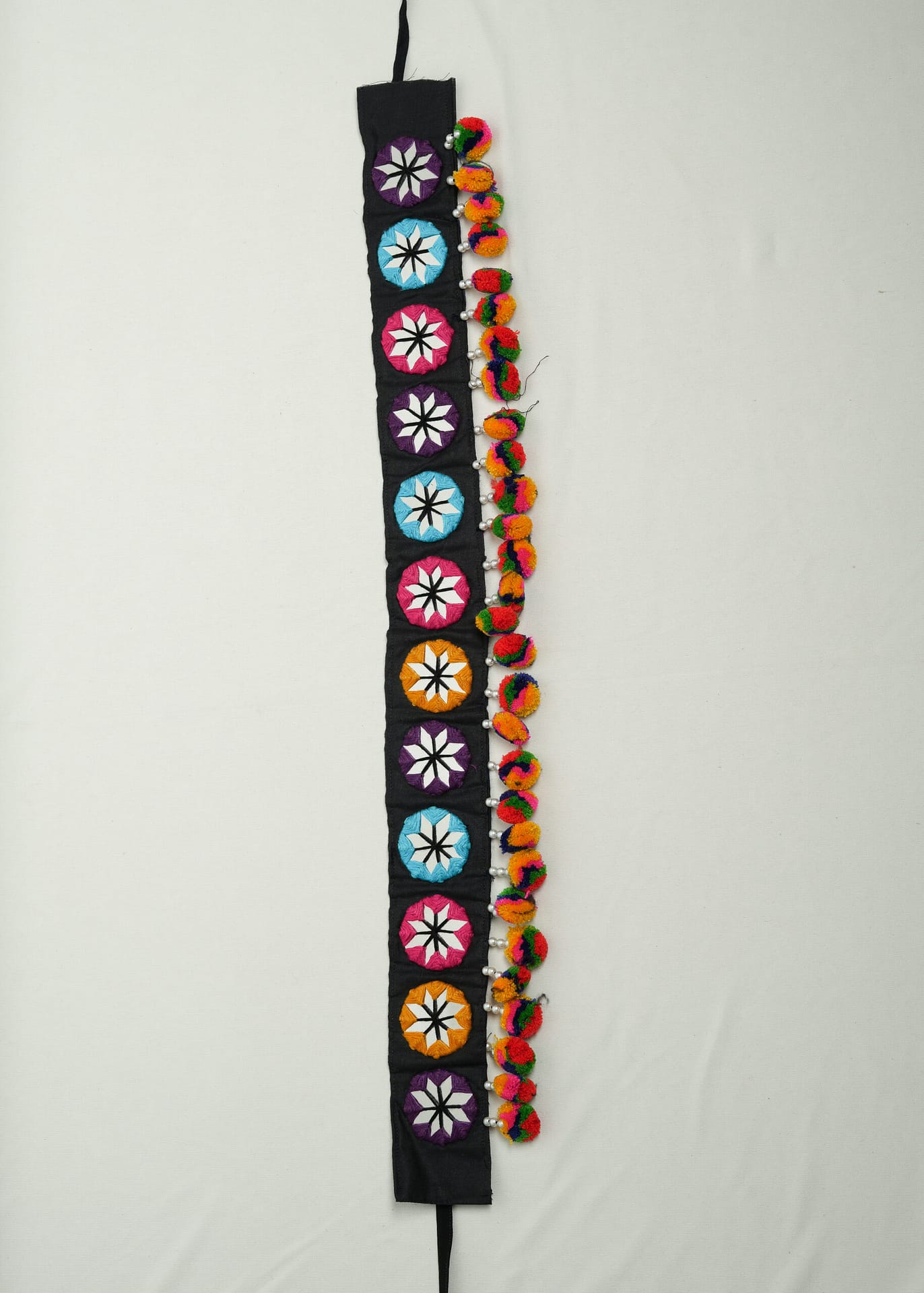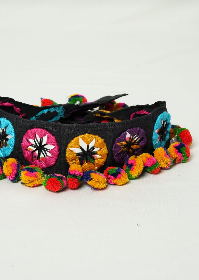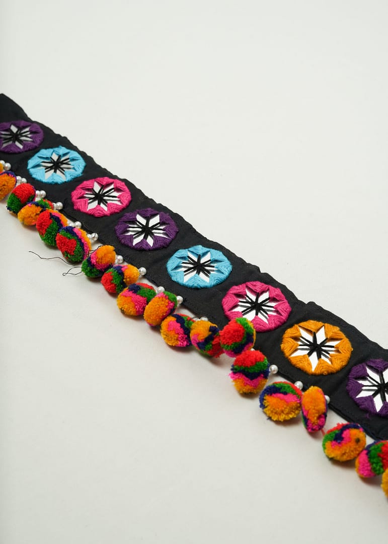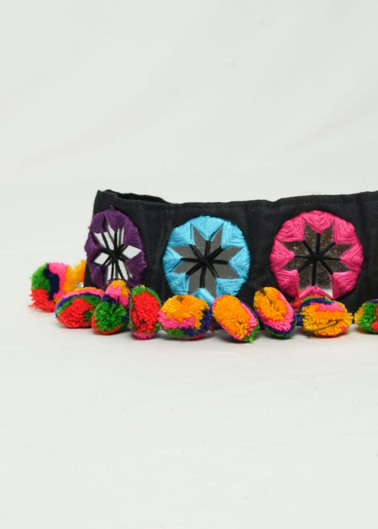 Vibrant handmade Navratri kamarbandh with mirror work, multicolor pompoms & traditional embroidery — crafted by artisans to elevate your festive style.