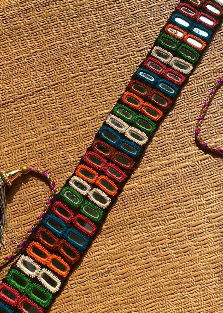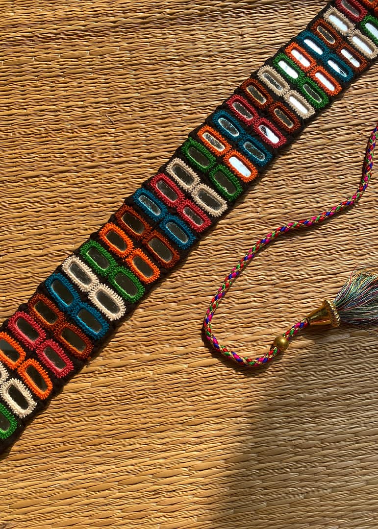 The Rectamirror belt stands out with its combination of rectangular mirrors and a vibrant, crochet frame. The belt features lively colors such as orange, green, and red, along with mirrored reflections that bring an eye-catching shine. Perfect for adding a modern twist to your ethnic or bohemian outfit, this handmade belt offers both style and cultural charm, making it a statement piece for any occasion.