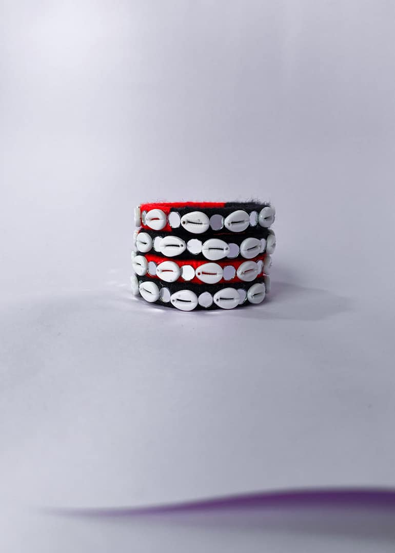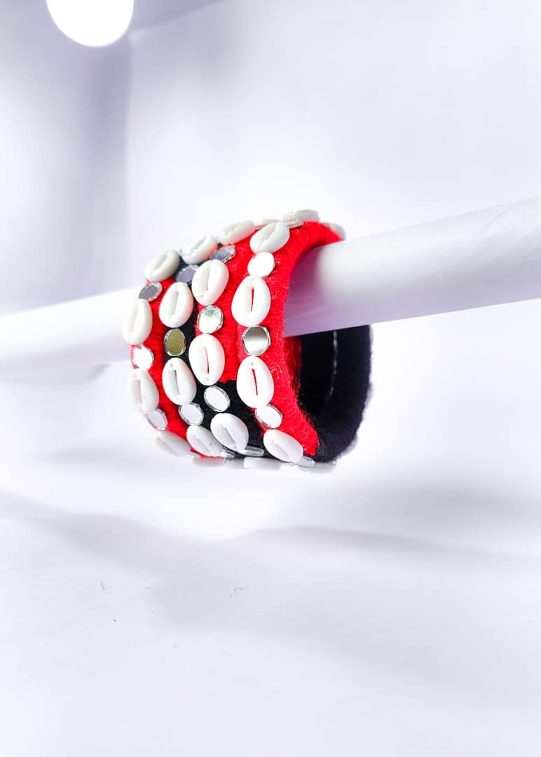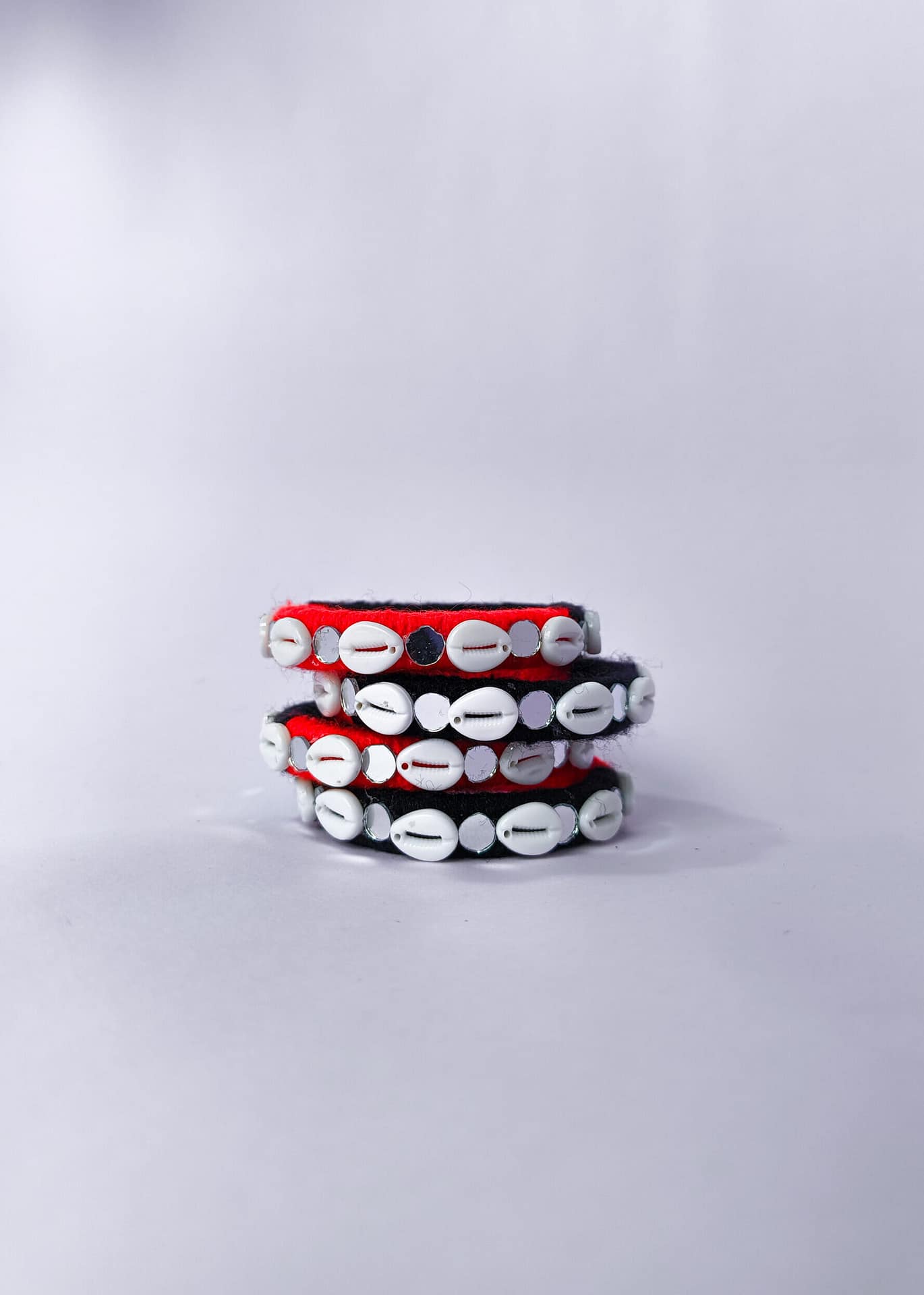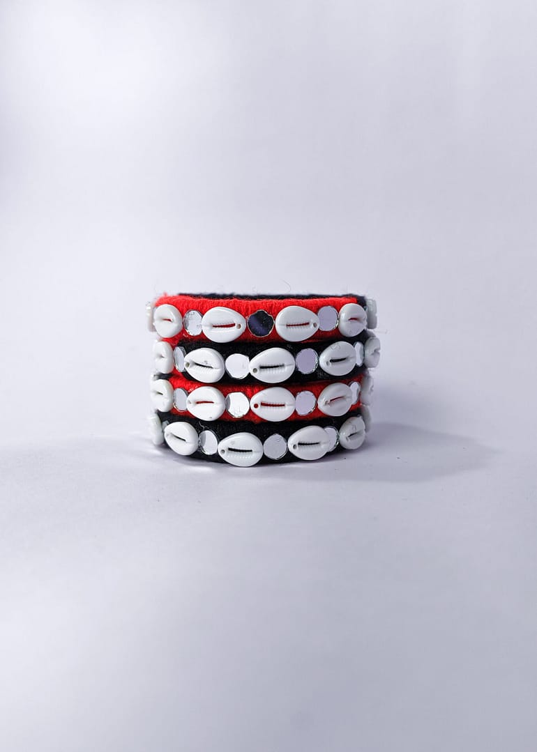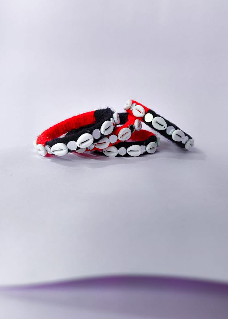 The Shankhika Kauri Bangles are a stunning example of traditional artistry blended with cultural symbolism. Handcrafted with precision, these bangles feature a bold red-and-black base decorated with cowrie shells (kaudi) and tiny mirror accents. In Indian tradition, cowrie shells have long been considered symbols of prosperity, feminine strength, and protection, making these bangles not just ornaments but also tokens of heritage and spirituality.