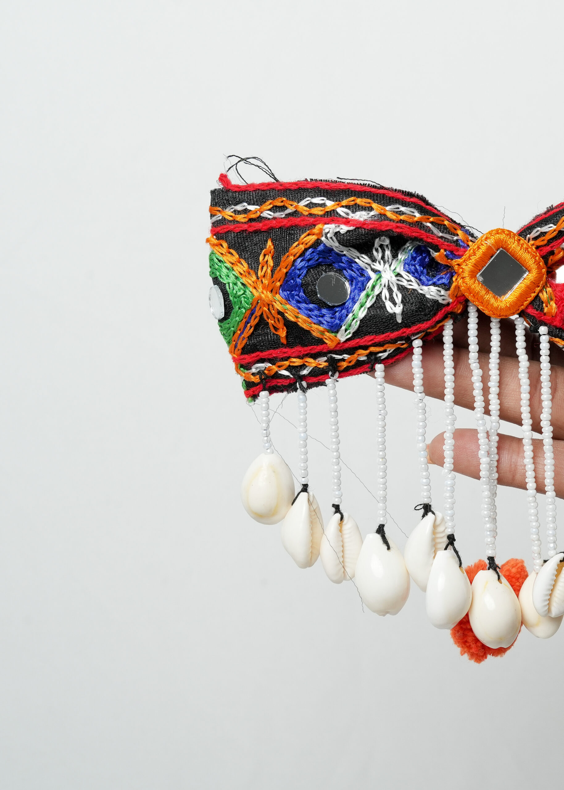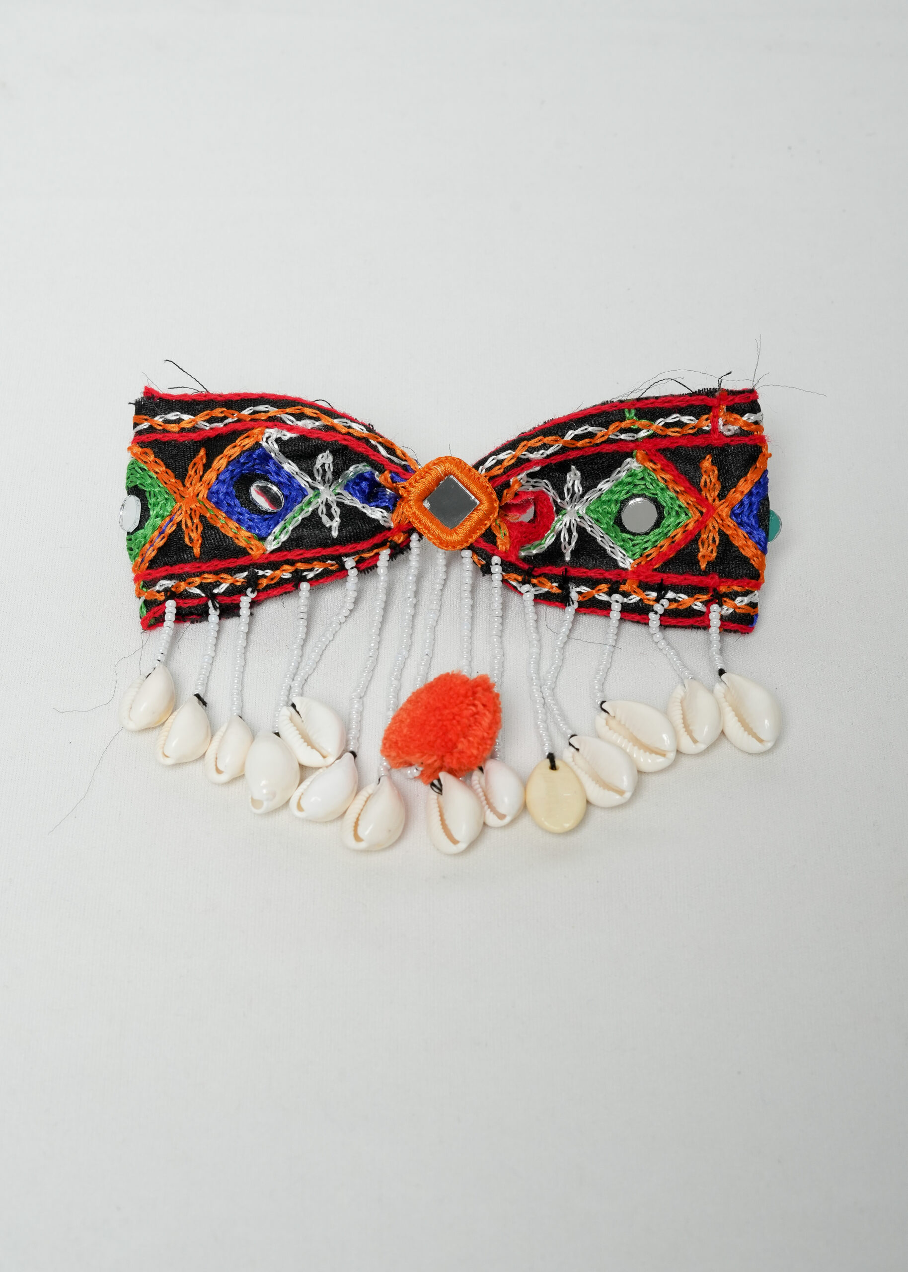 Elevate your festive hairstyle with this beautifully handcrafted shell drop hair bow. Designed with colorful thread embroidery and central mirror work, this bow features a cascading fringe of cowrie shells and white beads, with a fluffy orange pom pom as a centerpiece. Ideal for Navratri, Dandiya nights, or cultural events, it clips easily into hair and adds a statement finish. Whether styled with a bun, braid, or open hair, this accessory is sure to turn heads.