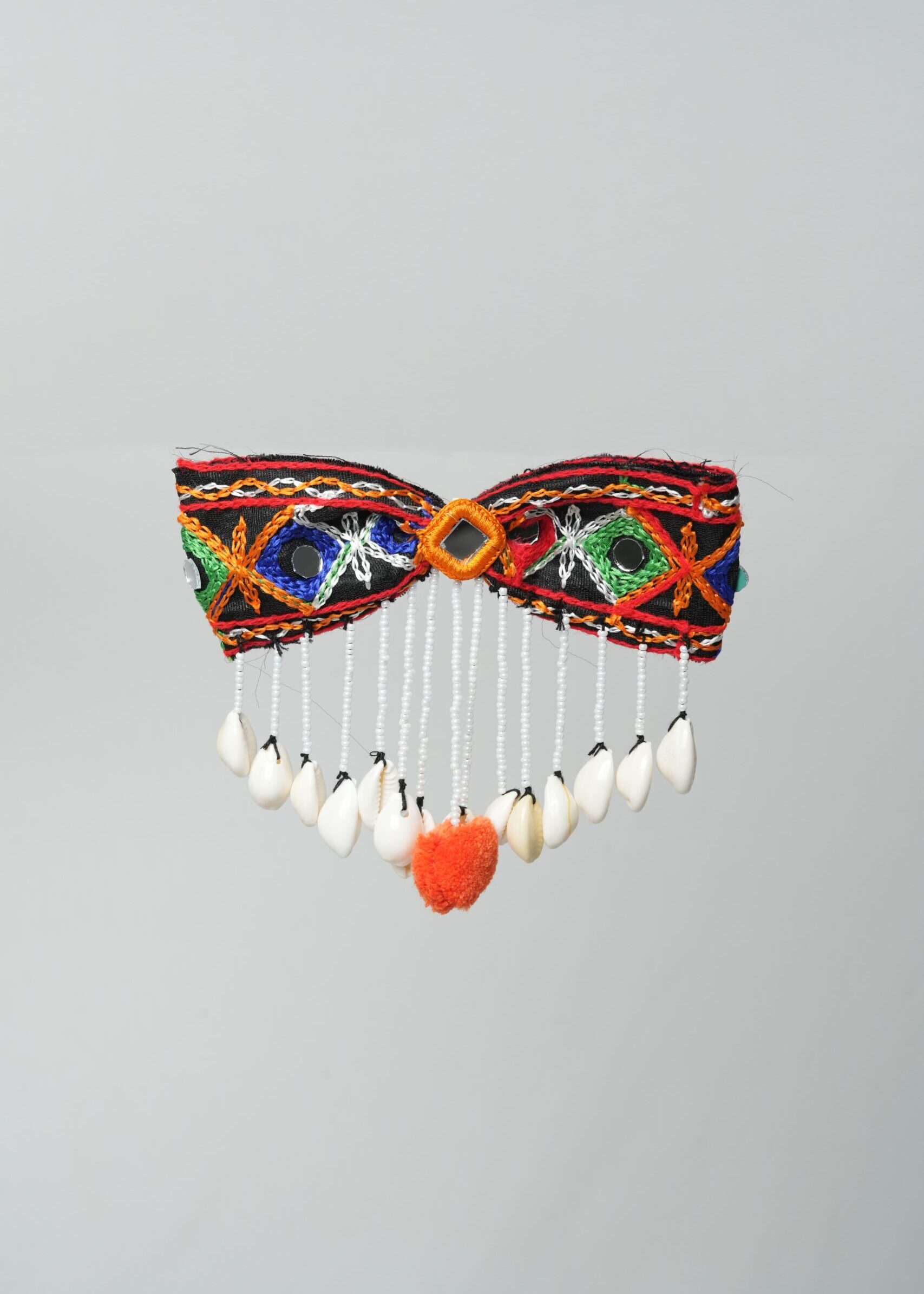 A festive hair bow with mirror embroidery, shell dangles, and a central orange pom pom for a perfect ethnic accent.