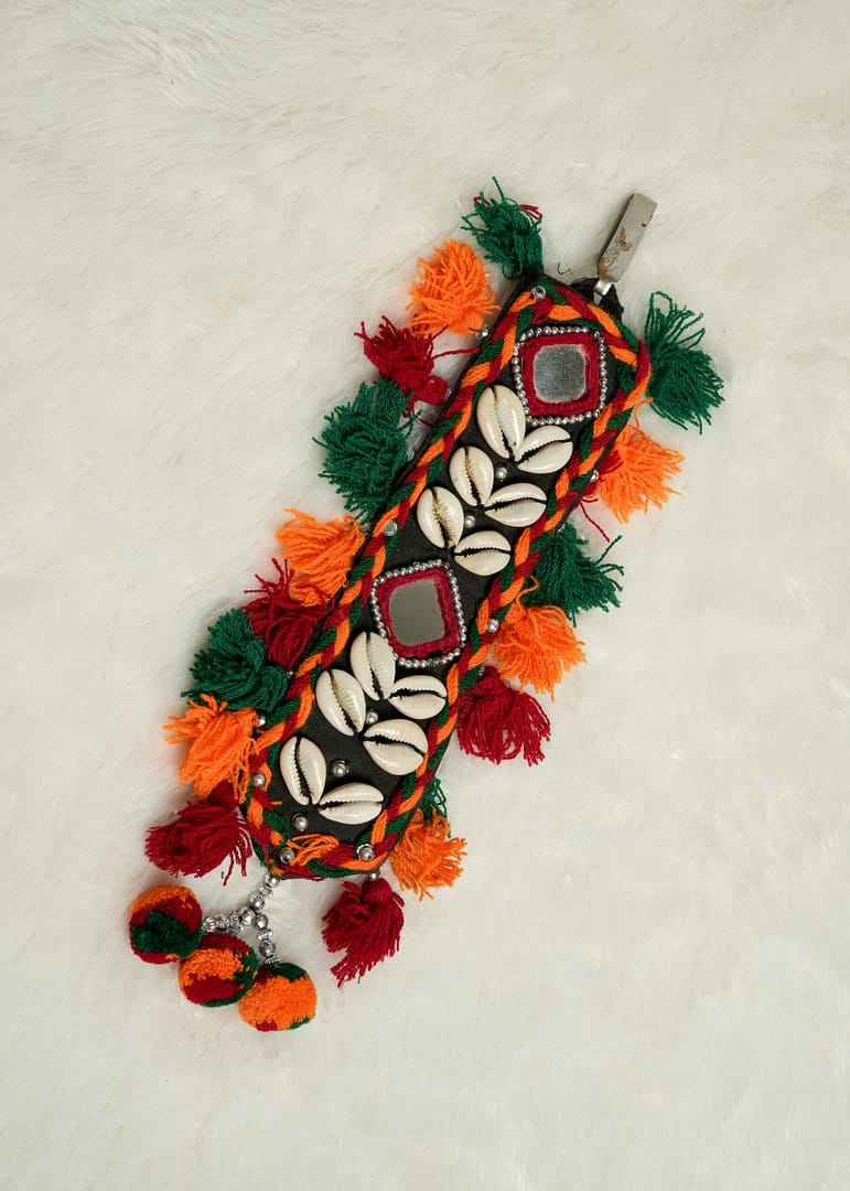 Handcrafted ethnic hand cuff designed for Navratri celebrations, adorned with colorful pom-poms, mirrors, and traditional threadwork to elevate your festive look.