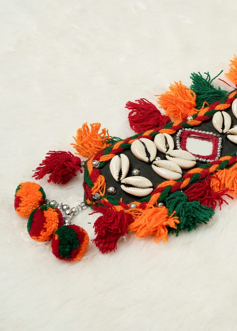 Brighten up your ethnic look with this vibrant, handcrafted mirror work necklace adorned with colorful pompoms and cowrie shell accents. Perfect for Navratri and festive occasions.