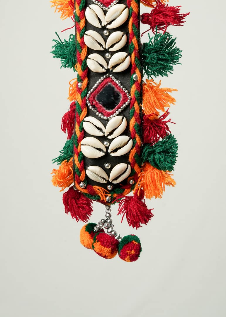 Make a bold cultural statement with this beautiful Shell & Mirror Work Latkan, designed exclusively for Navratri and other traditional festivities. This waist pendant features handcrafted detailing using cowrie shells, vibrant wool tassels, and mirror embroidery, perfectly embodying the spirit of Indian folk art.
