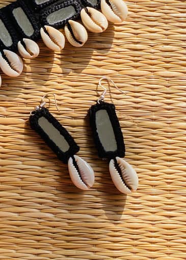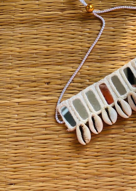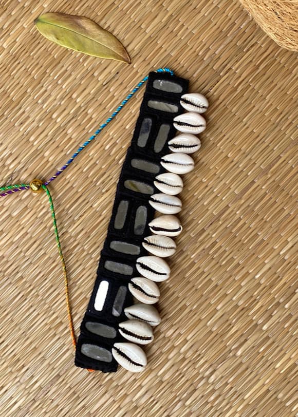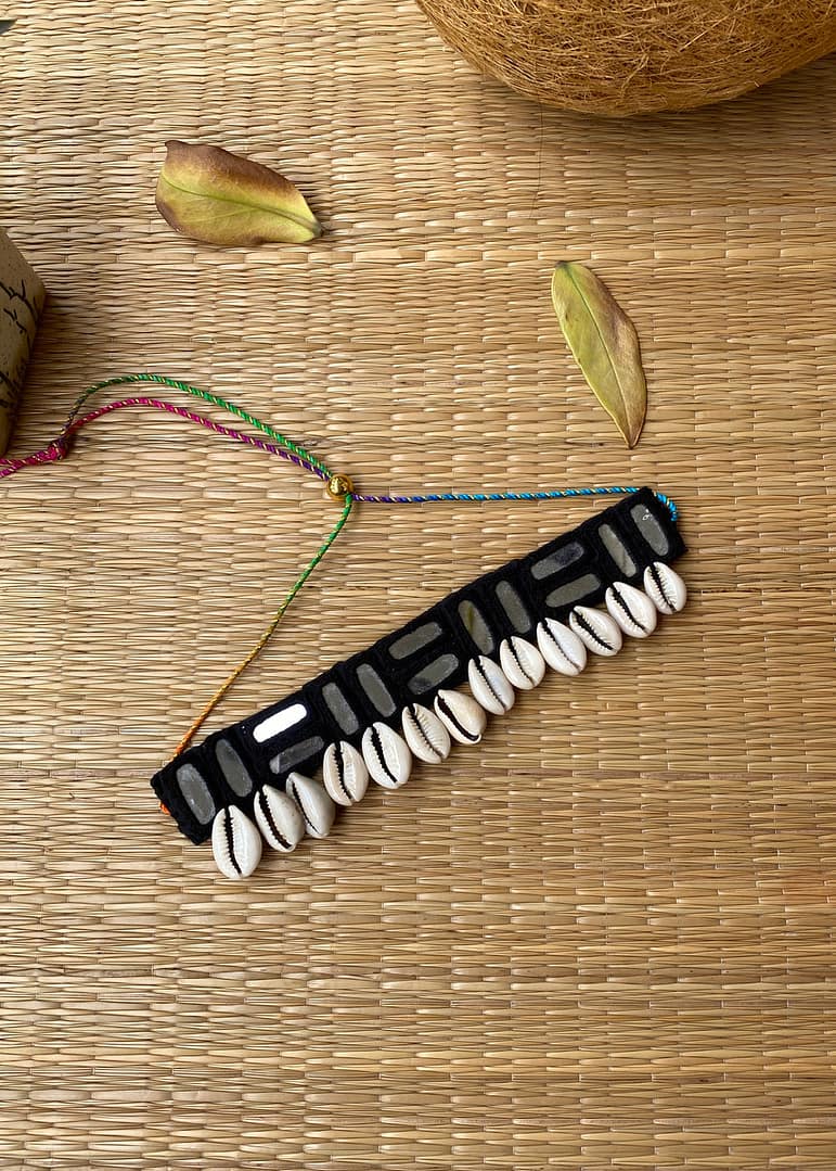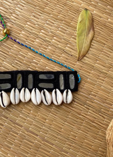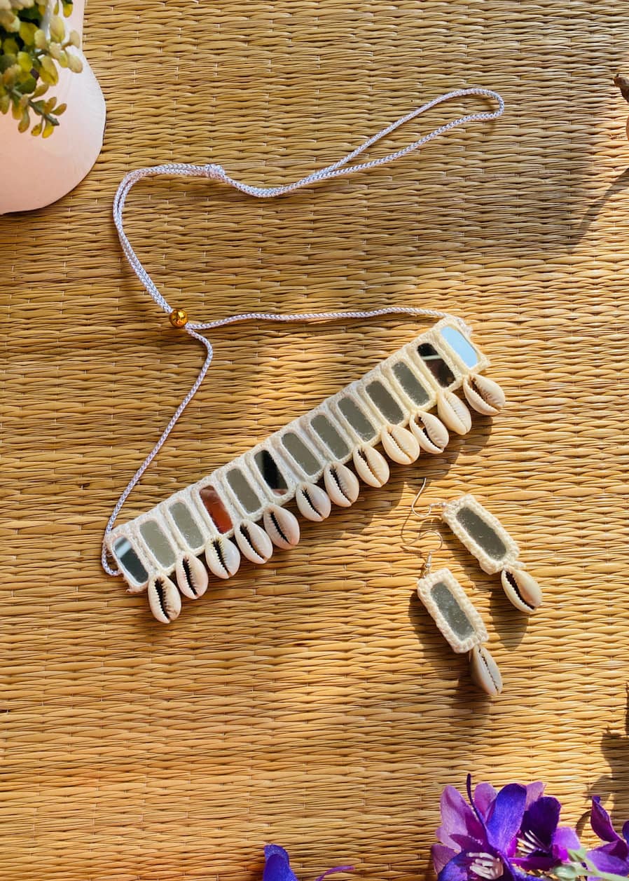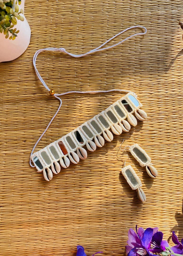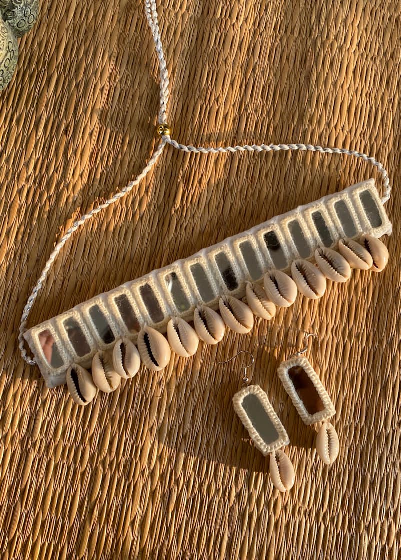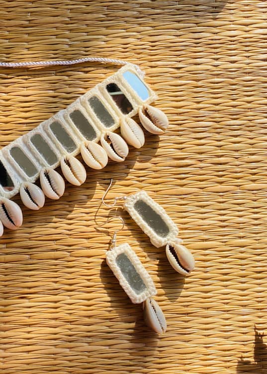 Every piece is hand-crocheted with love, using traditional threading techniques to frame reflective mirror patches, once used in tribal communities to ward off the evil eye. Cowrie shells dangle gracefully, believed to attract prosperity, fertility, and divine feminine energy.