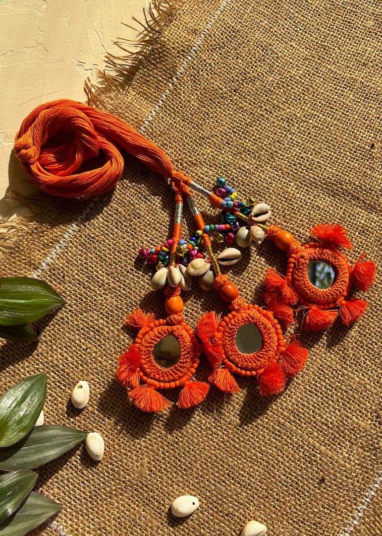 Handcrafted Kesarini Raas Kada with colorful crisscross threadwork and mirror embellishments — perfect to complete your Navratri and festive look.