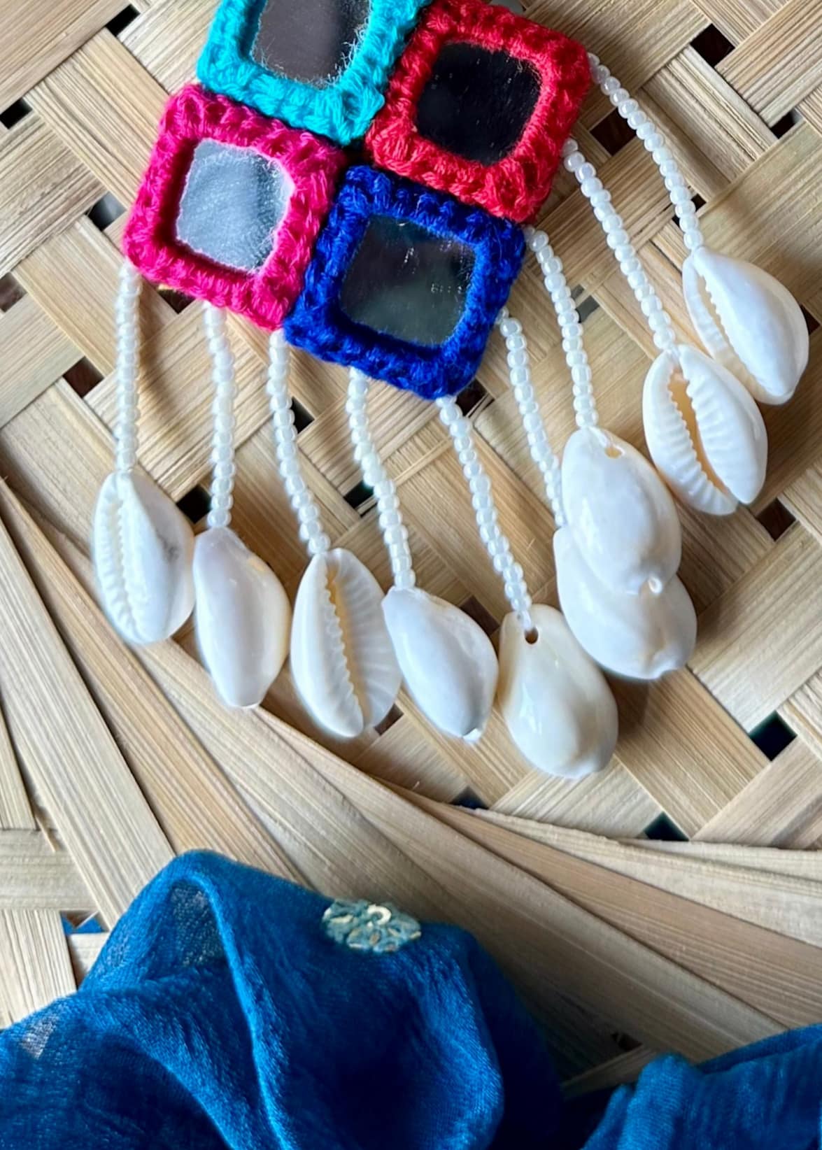 Celebrate the divine grace of Navratri with the Durgakamal Earrings — a vibrant blend of crochet mirror work and cowrie shells, perfect for your festive ensemble.