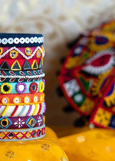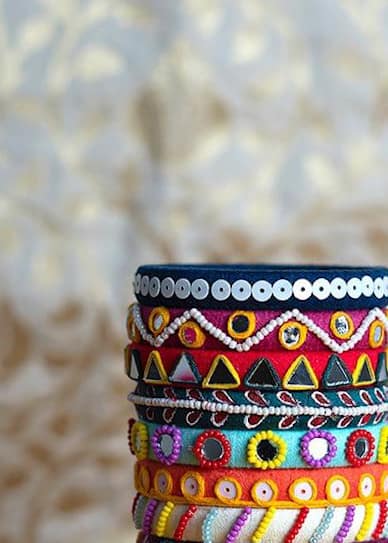 Celebrate the spirit of tradition with a pastel twist. The Phulora bangle set blends vibrant threads, shells, beads, and mirror work into an irresistibly festive stack.